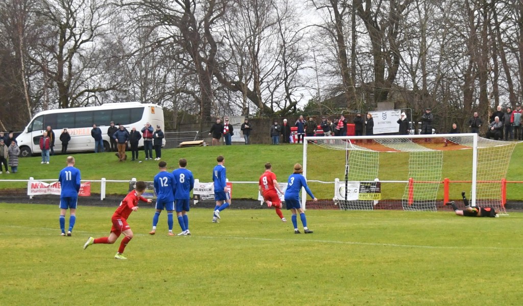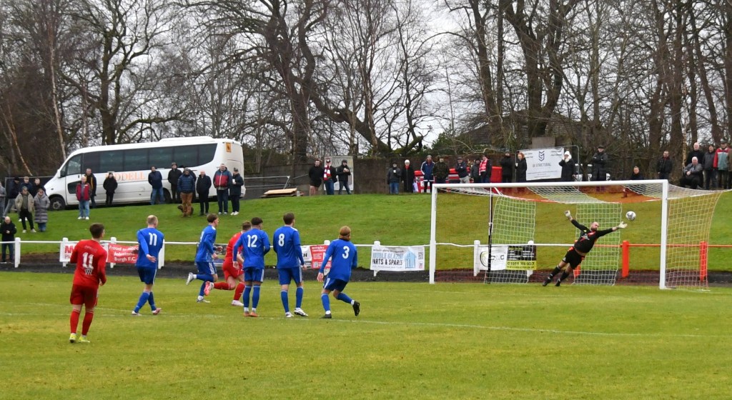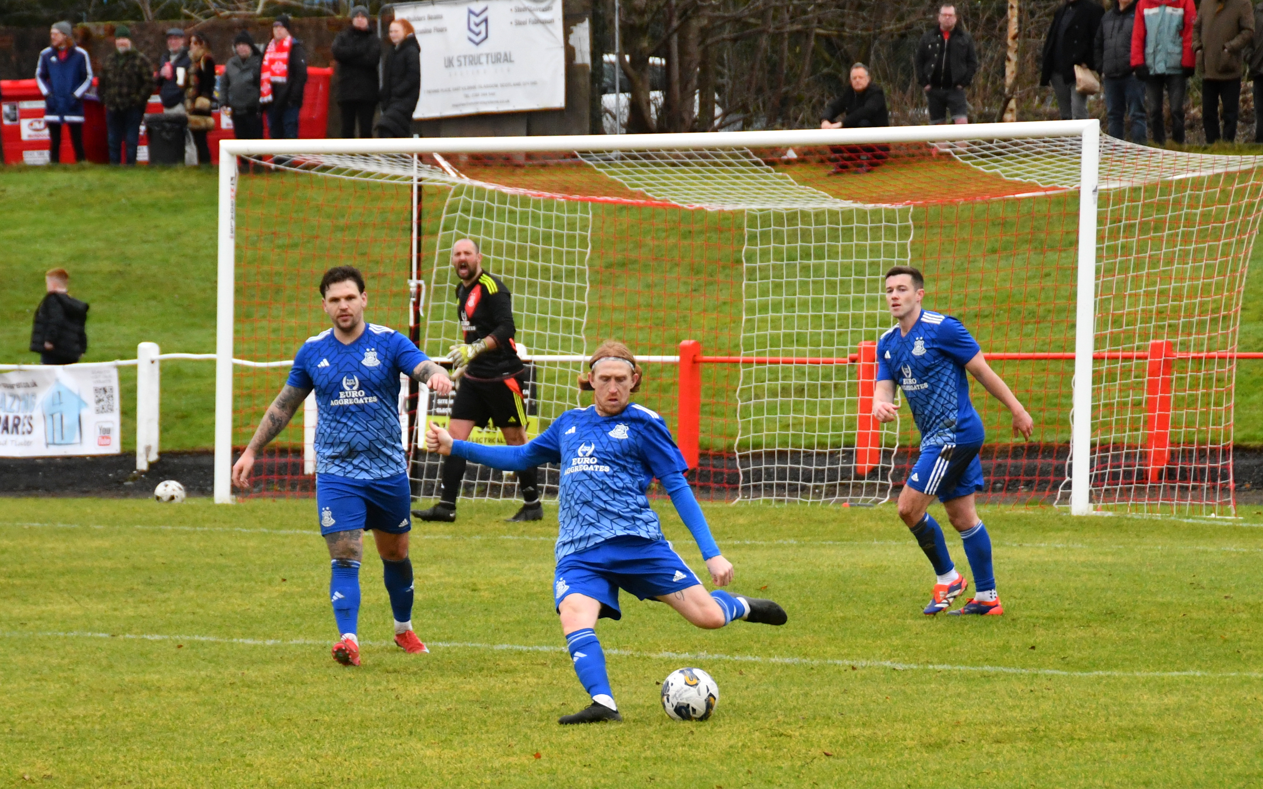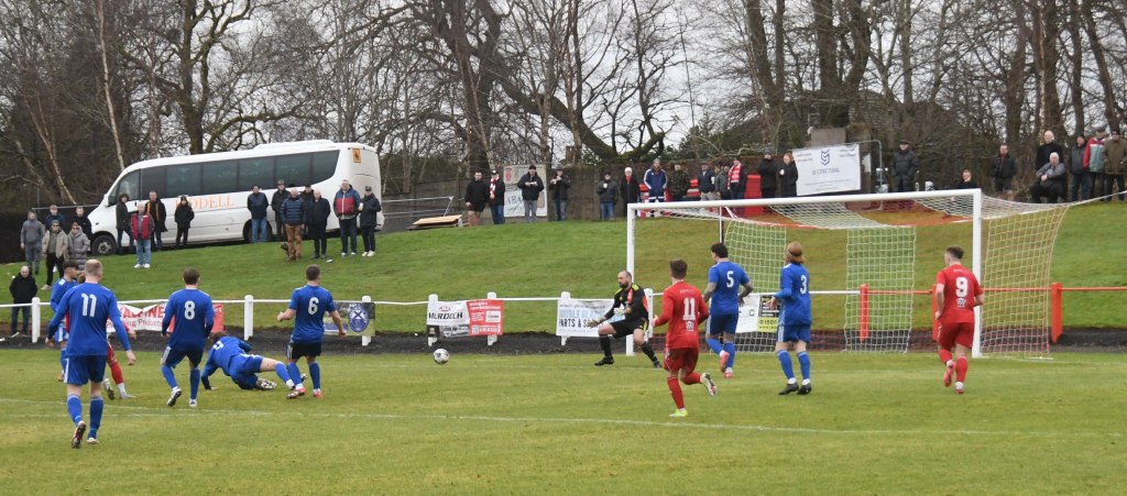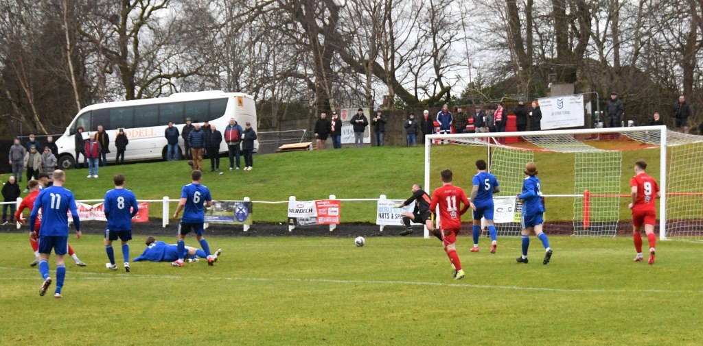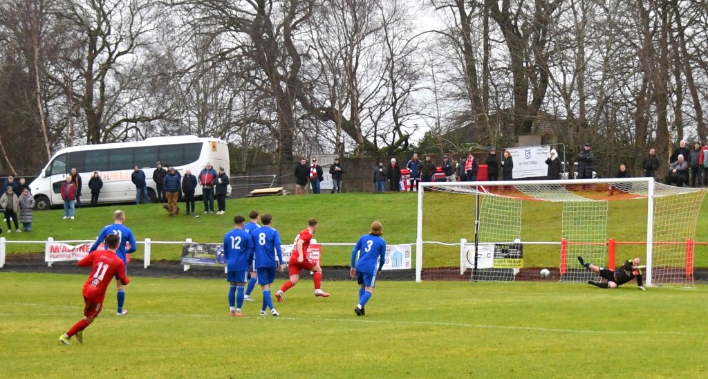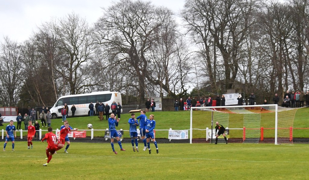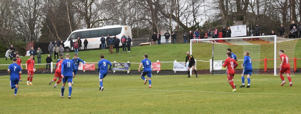 The home side’s tails were up and they swept forward in numbers and doubled their tally on 26 minutes. Ross Davidson, loanee from Stirling Albion, gathered the ball deep in the Glens half and played a slick one-two with Fraser Mullen tight on the right wing before threading a perfectly weighted forward pass into the box for Aiden Gilmartin to take a touch before squaring his pass between two Glens players to Smith who stabbed it back a few yards for Aaron Mason to drill a low shot from just inside the box into the left-hand corner of the goal. Burgh 2 Glens 0.