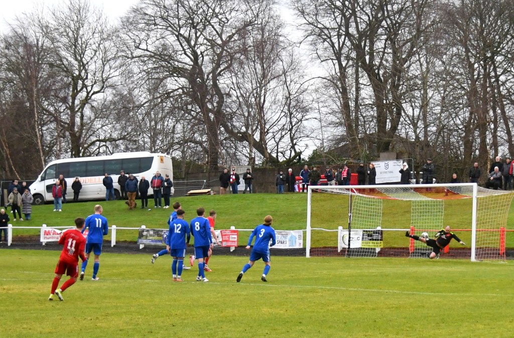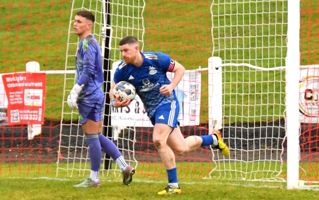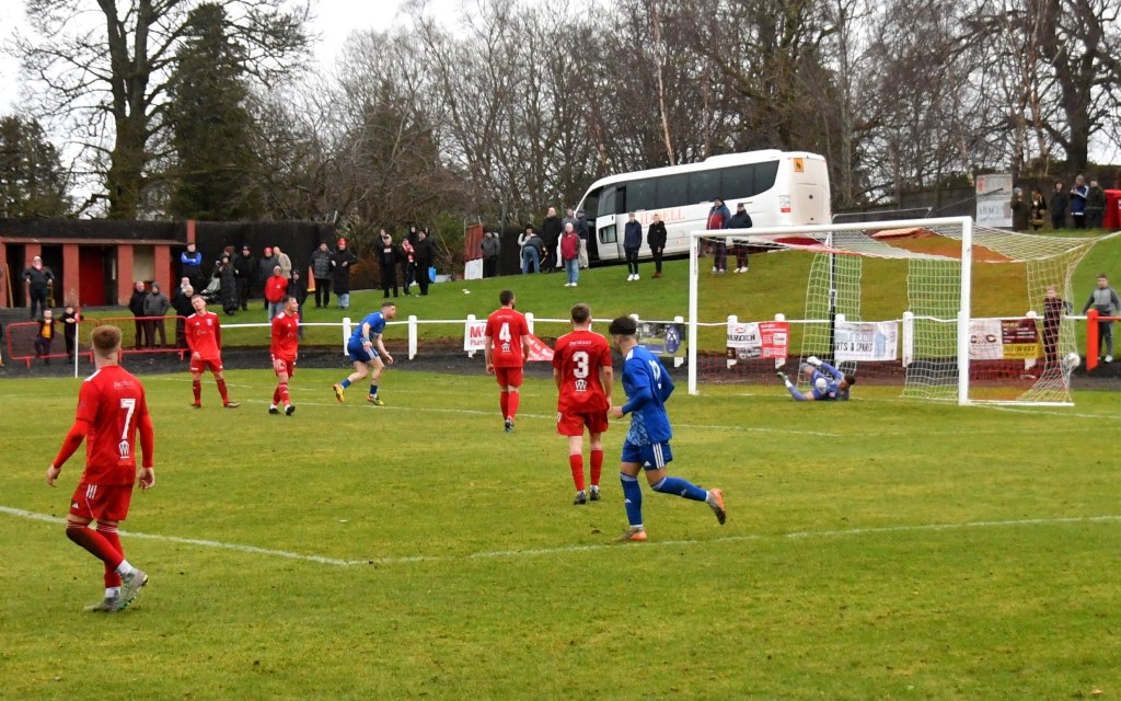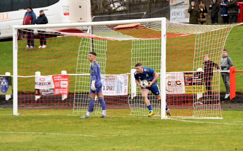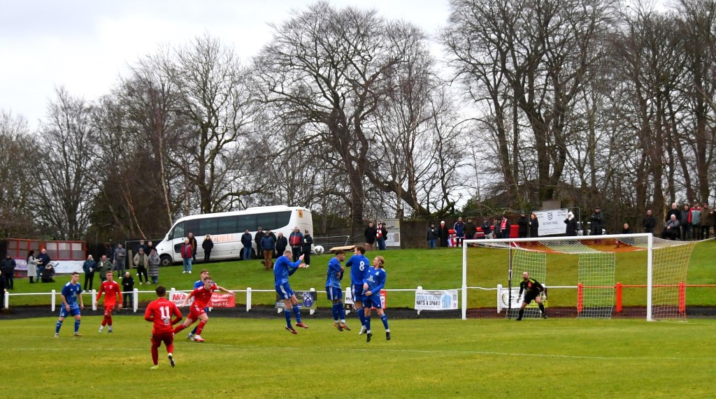 At the other end Glens won a free-kick tight on the right wing some 25 yards from the bye-line. Ross Lindsay whipped the ball which cannoned off the two-man wall at the corner of the box sending the ball high into the air and although Scullion leapt to clear the ball it bounced off the side-netting and out for a corner-kick that ended with Allan’s header sailing over the bar.