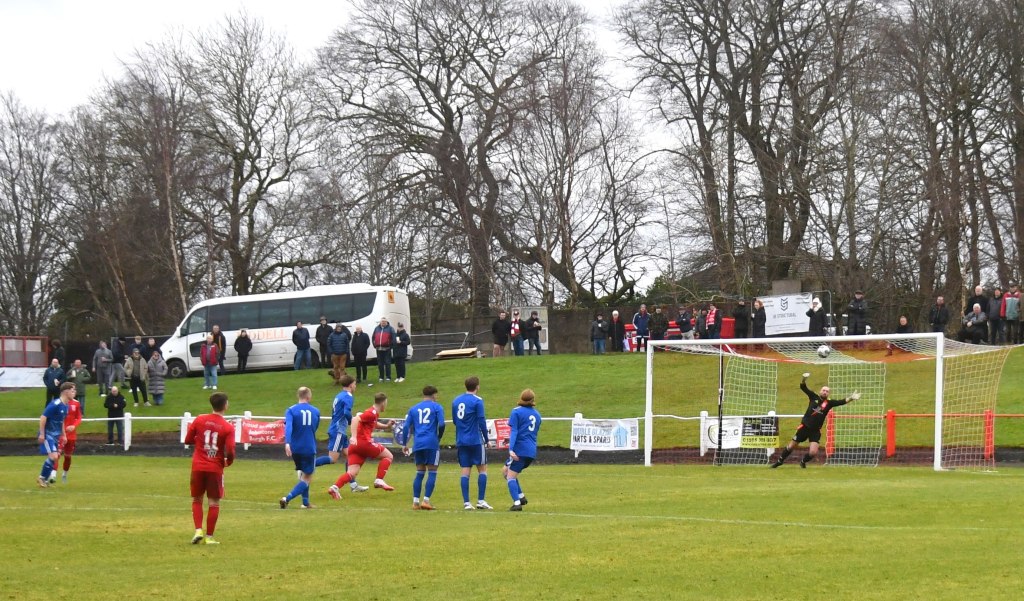 Play continued to flow back and forth at pace without either keeper being tested until the 24th minute. Smith weaved his way to the outskirts of the box to the right of the ‘D’ only to be clipped by Willet. Strangely, the referee sprayed the line for the Glens wall about a foot inside the box and the spot for the free-kick some 6 or 7 yards from the wall (making it more difficult for the kicker probably). However, up stepped Max Kerr to curl the ball over the heads of the leaping wall and beyond the reach of Markey at full stretch before crashing off the inside of the post and into the net. Burgh 1 Glens 0.