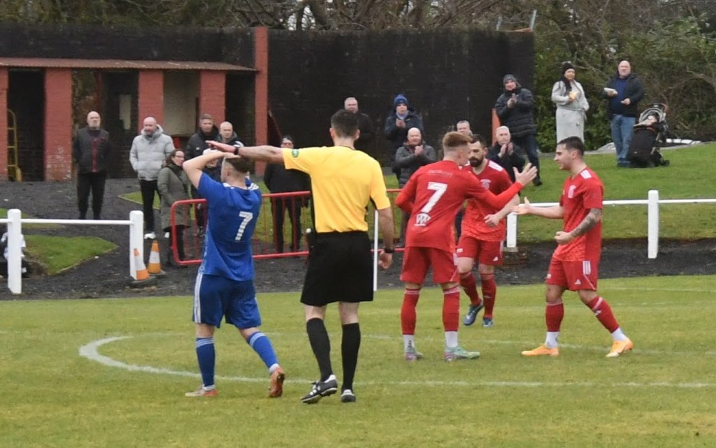 Glens replied through Michael Mullen gathering the ball inside the Burgh half and pushed forward to the outskirts of the right-hand side of the box before lashing a low diagonal shot from 25 yards out that keeper Luke Scullion did well to get down low and push wide and although Jared Willet chased down the loose ball his shot from the edge of the six-yard box was blocked by the back-tracking Fraser Mullen.