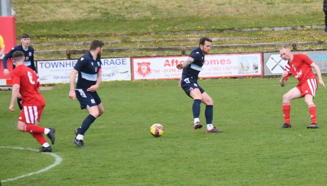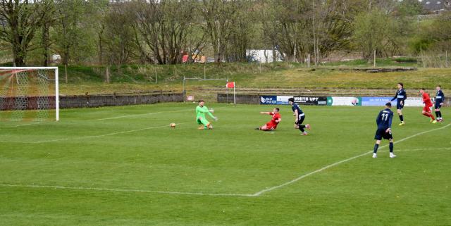 Two minutes later Erskine gathered the ball on the outskirts of the box and weaving his way into the ‘D’ he rolled the ball wide to Taggart breaking into the left-hand side of the box, only his shot didn’t match the quality of his run as the ball drifted high and wide of target.