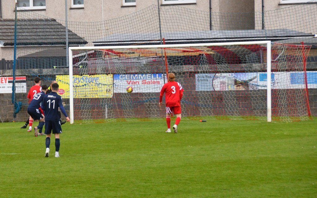 Back came Krol bursting down the left before cutting inside to the bye-line where Ross’s slide-tackle knocked the ball out for a corner. Dale Simeon curled the kick into the six-yard box where it took a bounce and struck the hand of Glens captain Ollie Rowe at the back post. There was little it he could have done about and the referee pointe to the spot ups stepped Harry Mitchell to send keeper David Markey the wrong way. Glens 0 Gartcairn 1, 7 minutes.