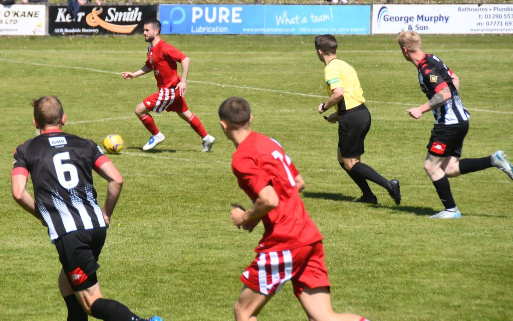 Midway through the half O’Kane burst down the left touchline and squared the ball into the box for the Docherty to blast a shot of goal only for it to crash of Rowe sending him to the ground triggering three Lok players to raise their arms to claim for a penalty, but the referee in close proximity played on. Andrew Gaffney chased down the ball and clipped it back into the box for Forde only for Holding to intercept and head it back to Markey.