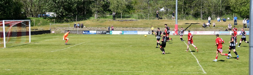 The water-break worked wonders on the home side as the Glens beginning with Willet’s throw-in from deep on the left and followed with a dozen or so passes involving most of the team that saw the ball ‘recycled’ as they say – up the left, across the park, back down the right, across the park for Willet to roll up the left wing for David Craig to square inside to Mullen and although O’Kane stabbed the ball from his toe it fell for Lindsay who fed Evan Maley, in space in the centre-circle in the Pollok half, from where the midfielder pushed forward to the outskirts of the ‘D’ and cracked a shot beyond the diving keeper, at full stretch some five yards off his line. Glens 1 Pollok 0, 27 minutes.