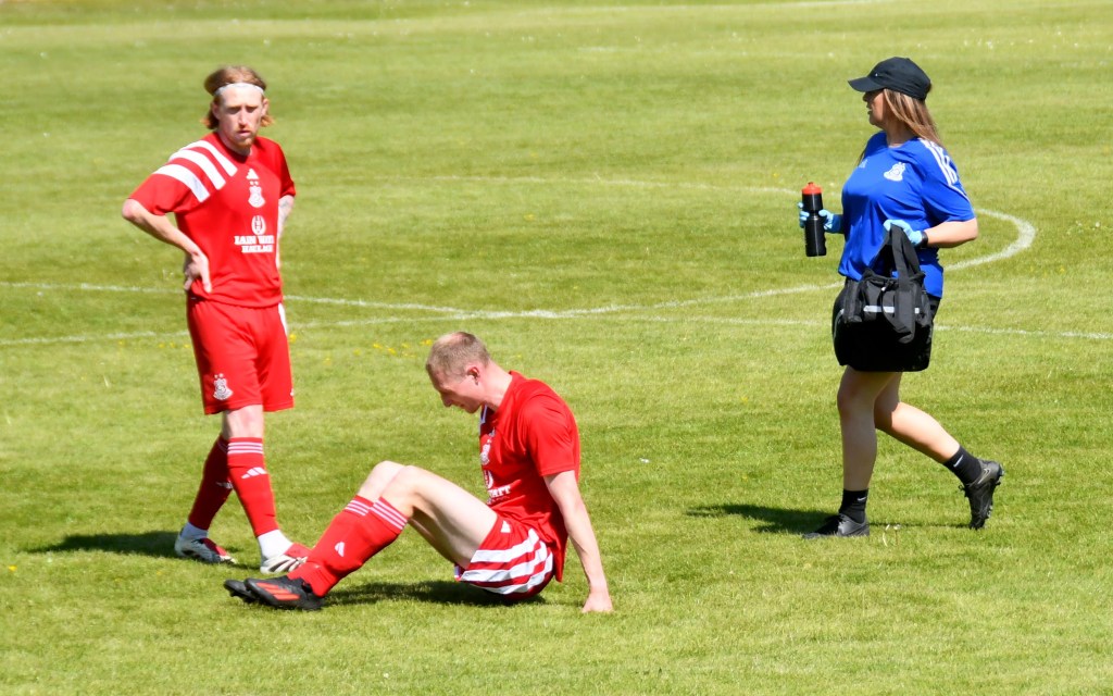 On 43 minutes Willet, on the left and deep in Pollok’s half, took a short throw to Erskine who took a sore one, before Willet picked up the loose ball and slipped it to Kerr to drive to corner of the box and few steps later with a wall of Lok players in his way he rolled the ball back to Mullen on the 18 yard line to curl a thunderous shot round a clutch of players and beyond the keeper who could only watch as the ball smashed off the crossbar and in danger of taking out the oystercatcher that had been circling the ground for most of the game. Meanwhile Chris Erskine required treatment from physio Laura Pagan, in what was her final match with the Glens.