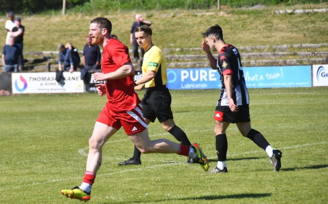 The Glens defence was kept busy with Lyall Holding leaping high on the six-yard line to head clear Sean O’Donnell’s attempt to pick out the inrushing Stephen Docherty. Markey was kept busy having to race the far corner of the penalty box and soon after cleanly clutch a high ball to the near post.
