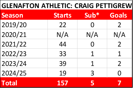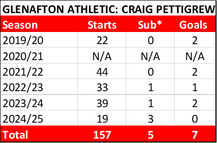 Craig made 44 starts in league and cup games and bagged a couple of goals, both in the league. A bullet header from 6 yards out in a 1-0 home win over Bonnyton Thistle and and header into the roof of the net in a 4-1 win away to Cumnock Juniors.