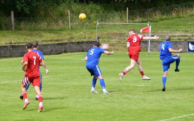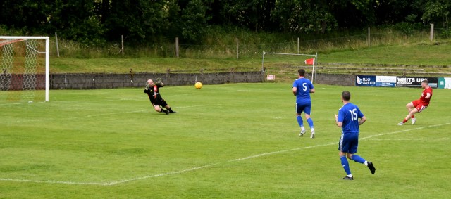 Back came the Glens with Duncanson on the right exchanging passes with Ross and McFadyen before picking out Kerr who held of the challenge of Cairn and Gray before cracking a shot from 22 yards that sailed high and wide of target.