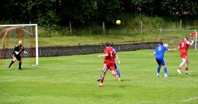 Glens countered with Chris Erskine picking up the ball in the centre circle before breaking down the right and into the corner of the box only to meet a three-man wall of Darren Frye, Craig Menzies (Johnstone Burgh) and Alan Cairns (Ardrossan Winton Rovers) forcing him to clip ball down the wing for Lee Duncanson to lot a high ball into the six-yard batch which was cleanly clutched by keeper Brian McGarrity.