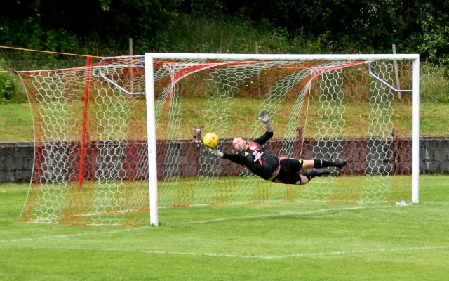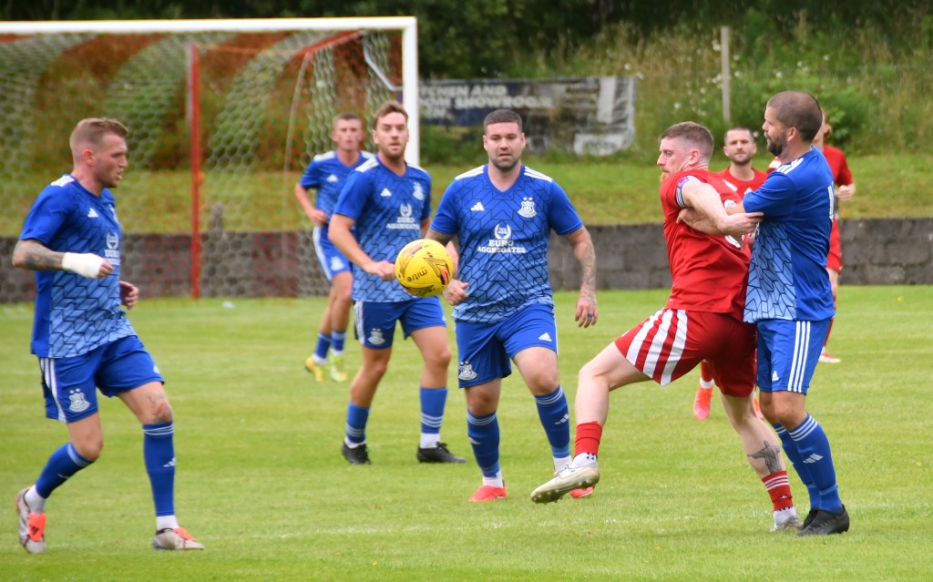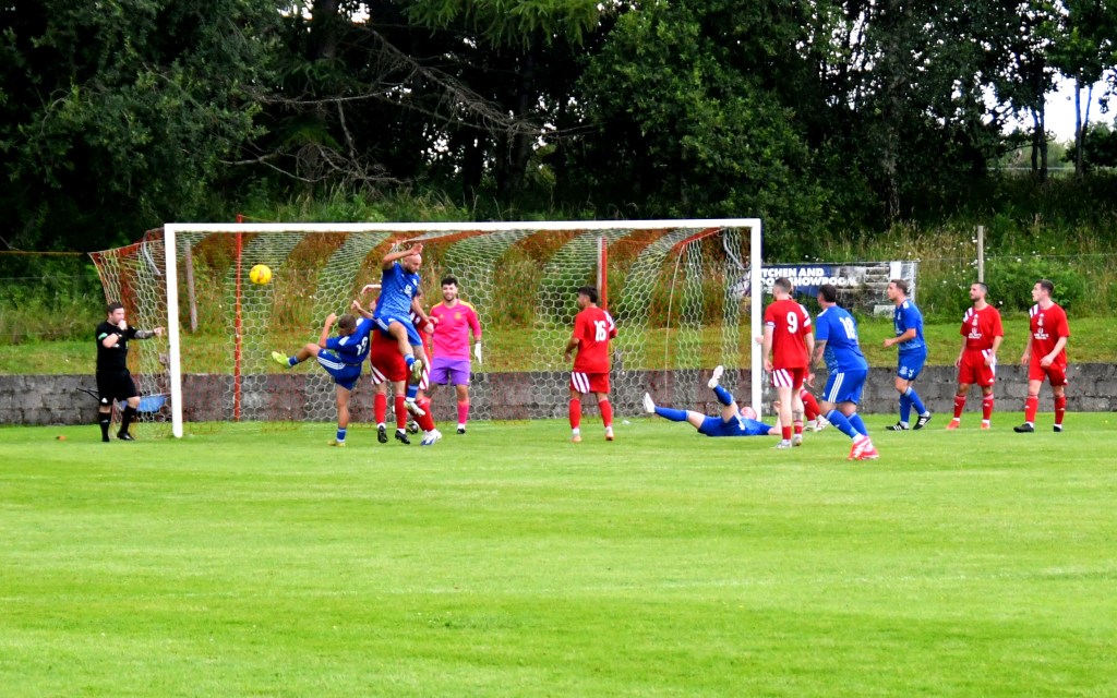 Played then ‘raged’ back and forth in the sweltering heat. Erskine in a busy box picked out Kerr on the six-yard only for his shot to deflect off McAusland and ball slip inches wide of the back post. Ross Lindsay corner kick was headed clear by McGeoghan, head and shoulder above a clutch of players from both sides. Glens continued to press, however without testing MGarrity.