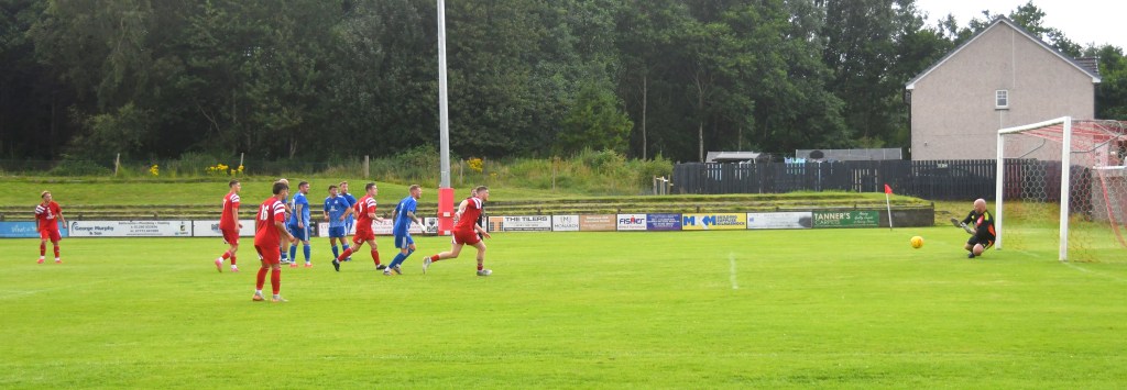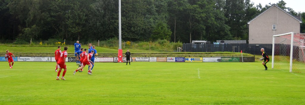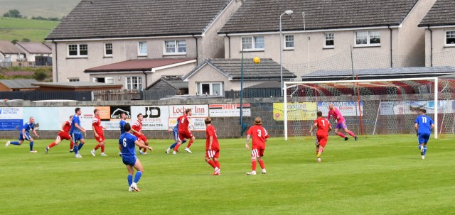 Ross Lindsay floated the corner high into the box where Kerr head and shoulders abin them a’ bulleted a downward header the bouncing up from the six-yard line and controlled on the chest of Menzies who then combined with McGeoghan to clear the ball of the box.