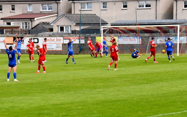 Soon after a free-kick was won a few yards short of the box and dead-ball specialist David Gray attempted to curl the ball over the three-man wall and into the arms of keeper David Markey, claiming it had struck one of the leaping players, Jared Willet & David Craig, on the arm, but the referee was not convinced!