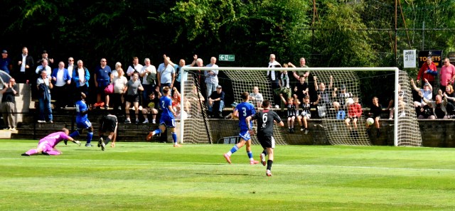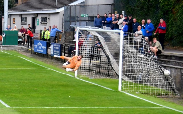 However, the home side rallied and mustered one final fling in a minute into added time. Scott floated a free kick from the left into the box with players from both sides stretched along the 18-yard line and as the ball was headed deeper into the box an almighty stramash ensued. The ball fell for McHugh and his close range shot was blocked by Markey and it appeared that the Trialist’s attempt to poke home the rebound came off the post only for McCreath to force the ball nearer the goal line and Trialist so edged it over the line, seemingly from an offside position. The celebrations were short-lived on the sight of the assistant referee raising his flag for offside. The final whistle blew when Markey launched the free-kick up the park.