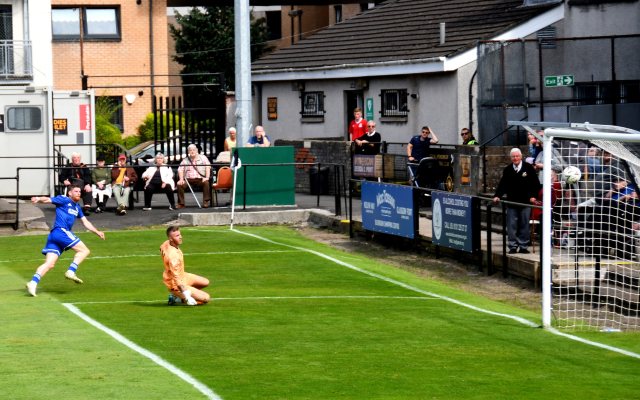 On 26 minutes the visitors made the break through. Duncanson tight on the right touchline overhit the ball upfield for Shuggy Kerr where it was gathered by McCreath in space. The defender weighed up his options of playing the ball inside to Henry or back to keeper White, he chose the latter as Kerr made his move, with a gently stroked ball to White who chose to wait at the penalty spot on the ball arriving before taking a touch to set up a clearance only to give the inrushing Kerr the opportunity to block the ball sending high into air and dropped two yards wide of the six yard line to be met by the Glens striker who then leathered the ball beyond the outstretched leg of the back-tracking keeper and high into the net from the tightest of angles. The former ‘Lok striker enjoyed the celebrations down the touchline in front of supporters of both clubs. Pollok 0 Glens 1, 26 minutes.