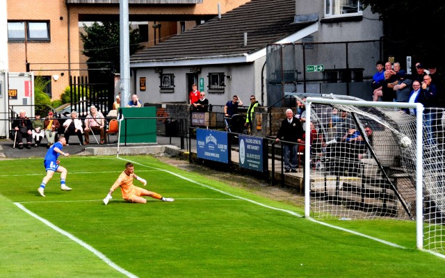 Although Glens enjoyed some good early possession it was Pollok that threatened first after Leydon pushed forward up the right before launching a high ball into the left-hand side of the Glens box where Gaffney whipped it across the face of the goal beyond Markey at the near post but also beyond the incoming Trialist at the back post.