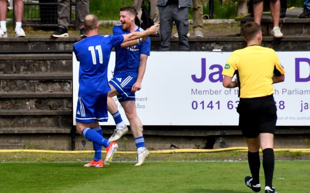 The visitors continued to press with a wave of attacks that each were foiled in turn including Duncanson’s break down the right that concluded with Scott clearing the ball only for it to fall for Lindsay to trap and lay it off to Chris Erskine to crack a low shot from 24 yards that forced White to get down low to push the ball sideways initiating a chase between Mullen and Scott, and it was the Pollok defender that cleared up the danger.