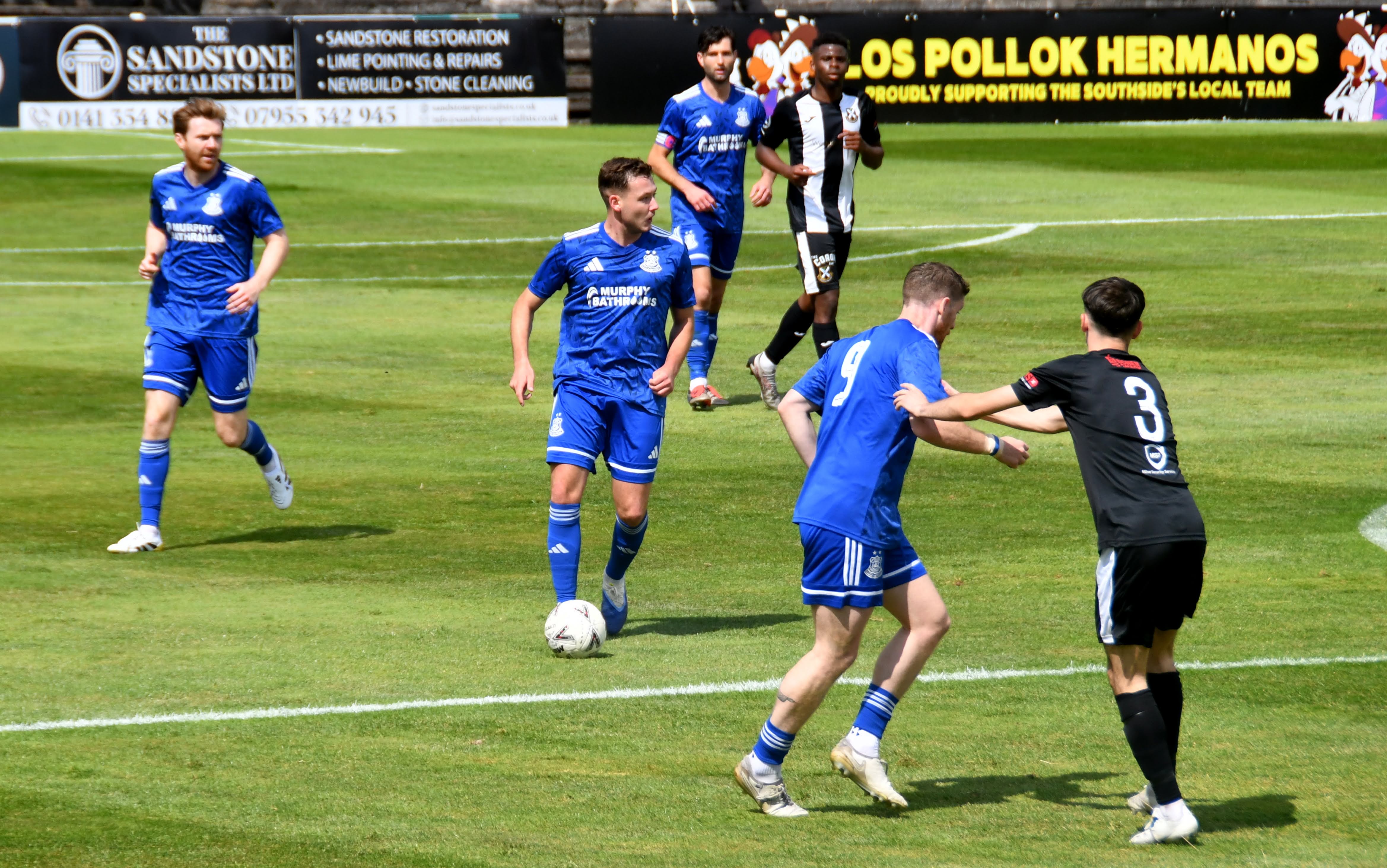 The momentum changed as Pollok turned up the heat in search of an equaliser on a glorious sunny day. Leydon clipped the corner from the left to the near post for Henry only for the ball to take a bounce into the goalmouth where the Trialist looked to chest the ball home from a few yards out only for Duncanson to get a boot to the ball and send it over the bar.