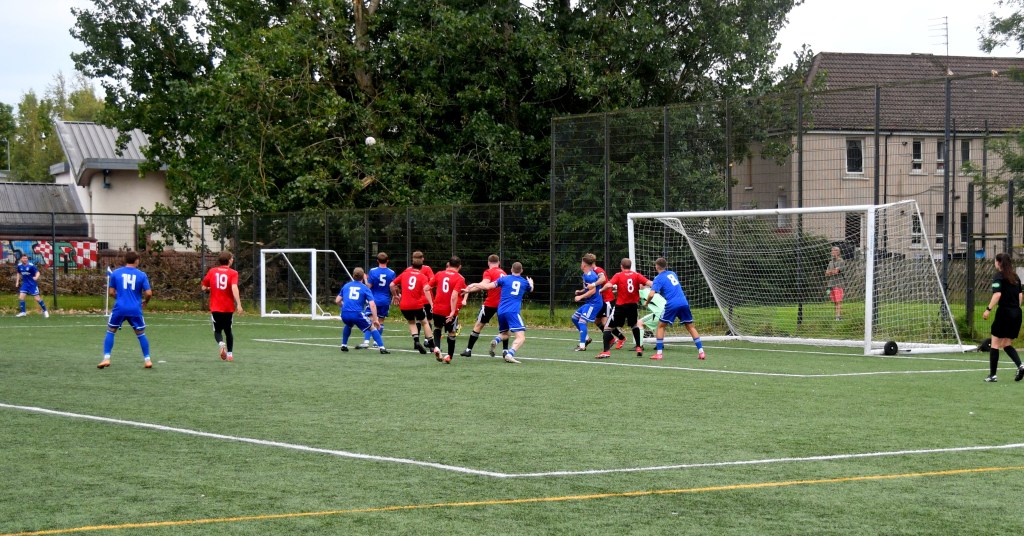 Two minutes later Lee Duncanson burst down the right and a few yards from the bye-line floated a great cross into the box which sailed inches over the head of the leaping Ryan Whitehorn to drop for Michael Mullen, on the outskirts of the six yard box, to hook the ball towards the back post only for Kilbride to pull off an acrobatic save to stop the ball on the line and his team-mate Johnny McKay to pounce on the loose ball and hoof the ball out for a shy.
