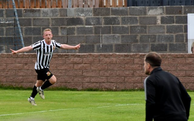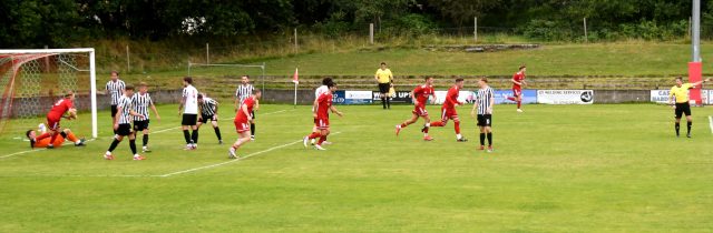 Beith kicked off and both sides enjoyed some early flurries into their opposition’s box before visitors carved out an early lead with a well worked goal. A high ball just over the half way line saw Allan Woodhouse crouch down low and head it out to the right for Connor O’Donnell to gather before slipping it upfield for Liam McGonigle to take a great touch and back-heel the ball into the path of the advancing Woodhouse who in turn slipped it forward to Tom Collins where from the edge of box he burst between two defenders in a diagonal run to right hand corner of the six-yard box before blasting a shot past keeper David Markey and into the roof of the net. Glens 0 Beith 1, 6 minutes.