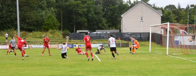 Half chances came and went at either end with the best falling to the Glens when Lee Duncanson launched a high ball from well inside his own half to edge of the Beith box where Mullen trapped the ball between Brown and Cummins and then lobbed it high over the advancing keeper Shaw now at the penalty spot, however he hurried back to his line in time to pluck the descending ball out the air.
