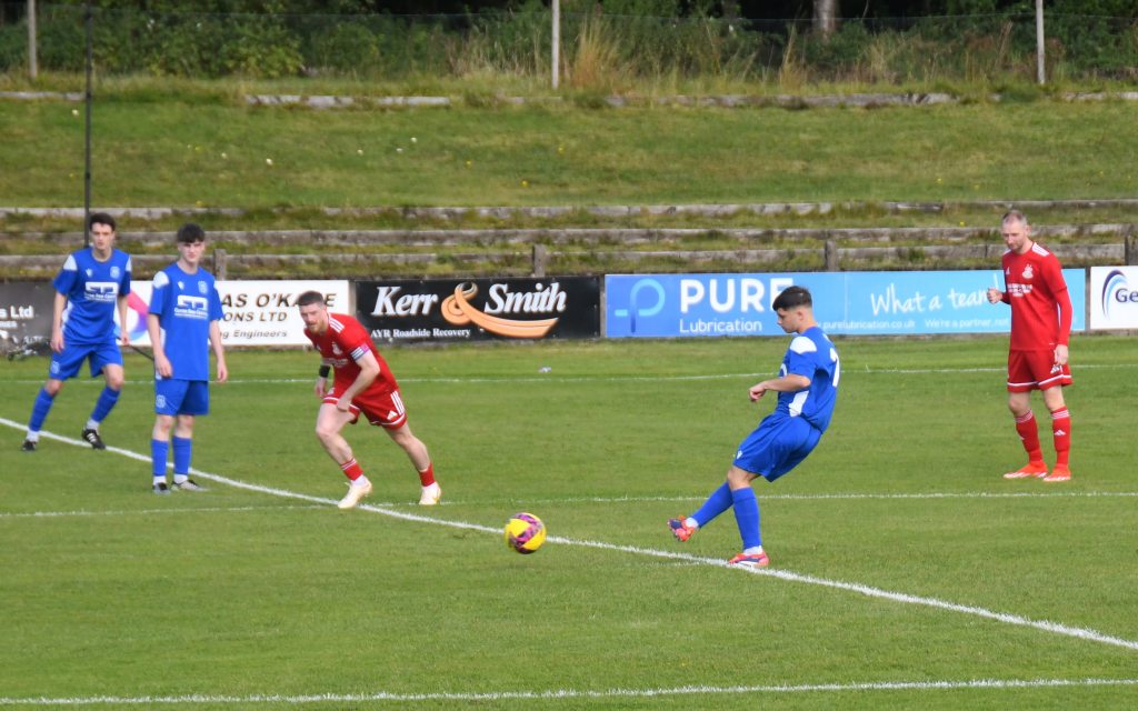 Yoker then mounted a slick box-to-box attack beginning with the keeper dropping the ball at the feet of Love in his six-yard box to the slip the ball to Carballo on the left who then played a quick one-two with McNair to progress to the centre-circle before squaring it to substitute Luke Gallagher. He, smartly back-heel the ball into the path of O’Brien who threaded a 25 yard pass upfield for Carballo to gather on the 18 yard line and hold off McFadyen and Willet before turning to leather a shot that whizzed over the bar.