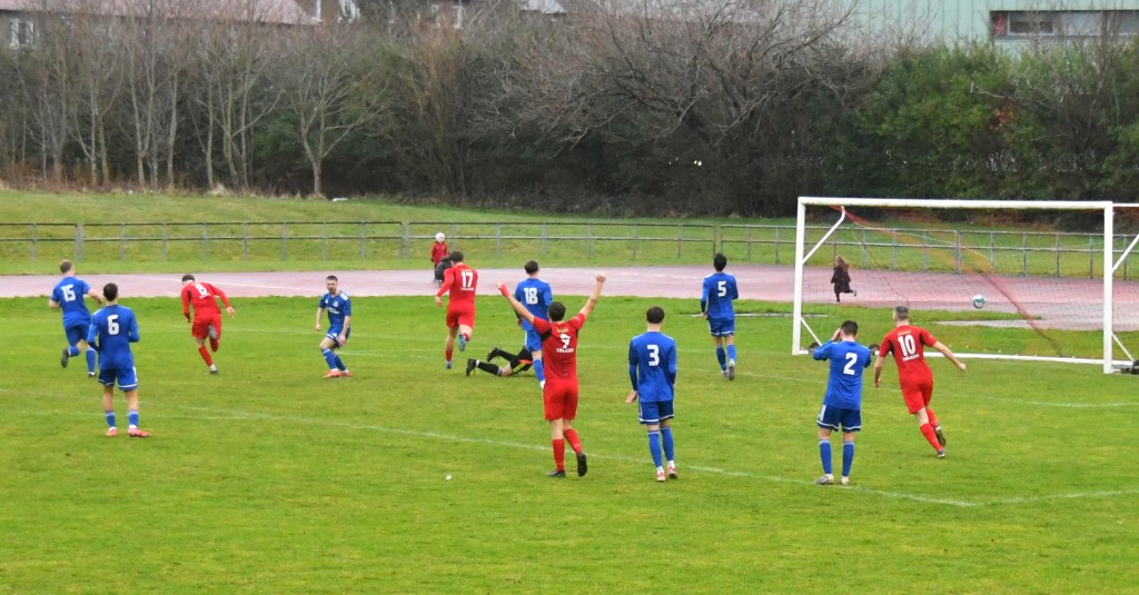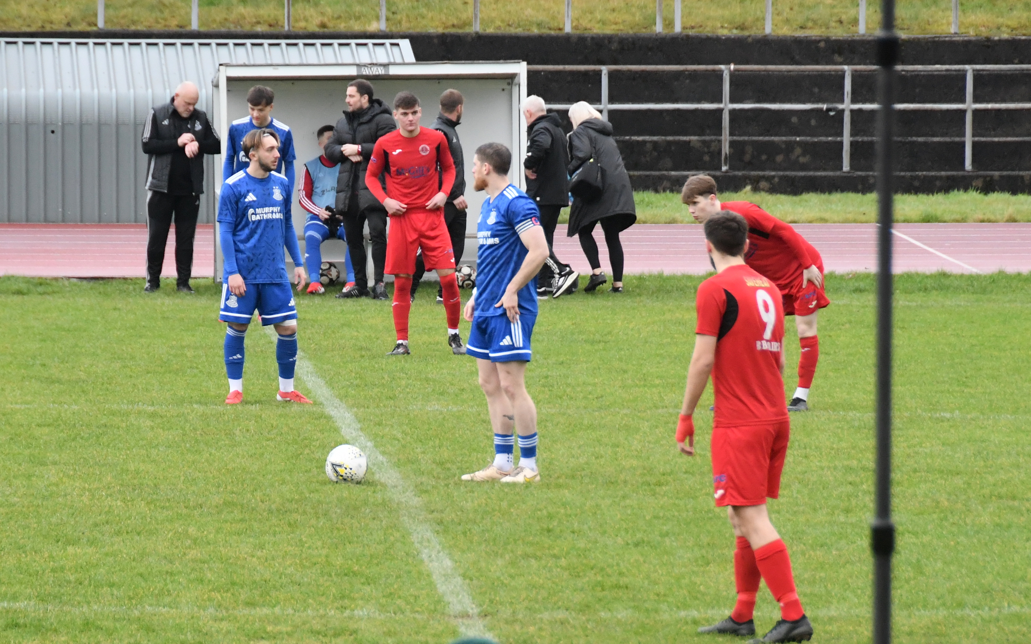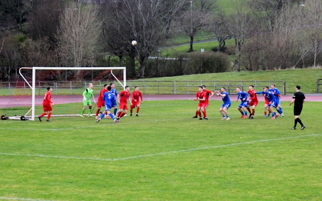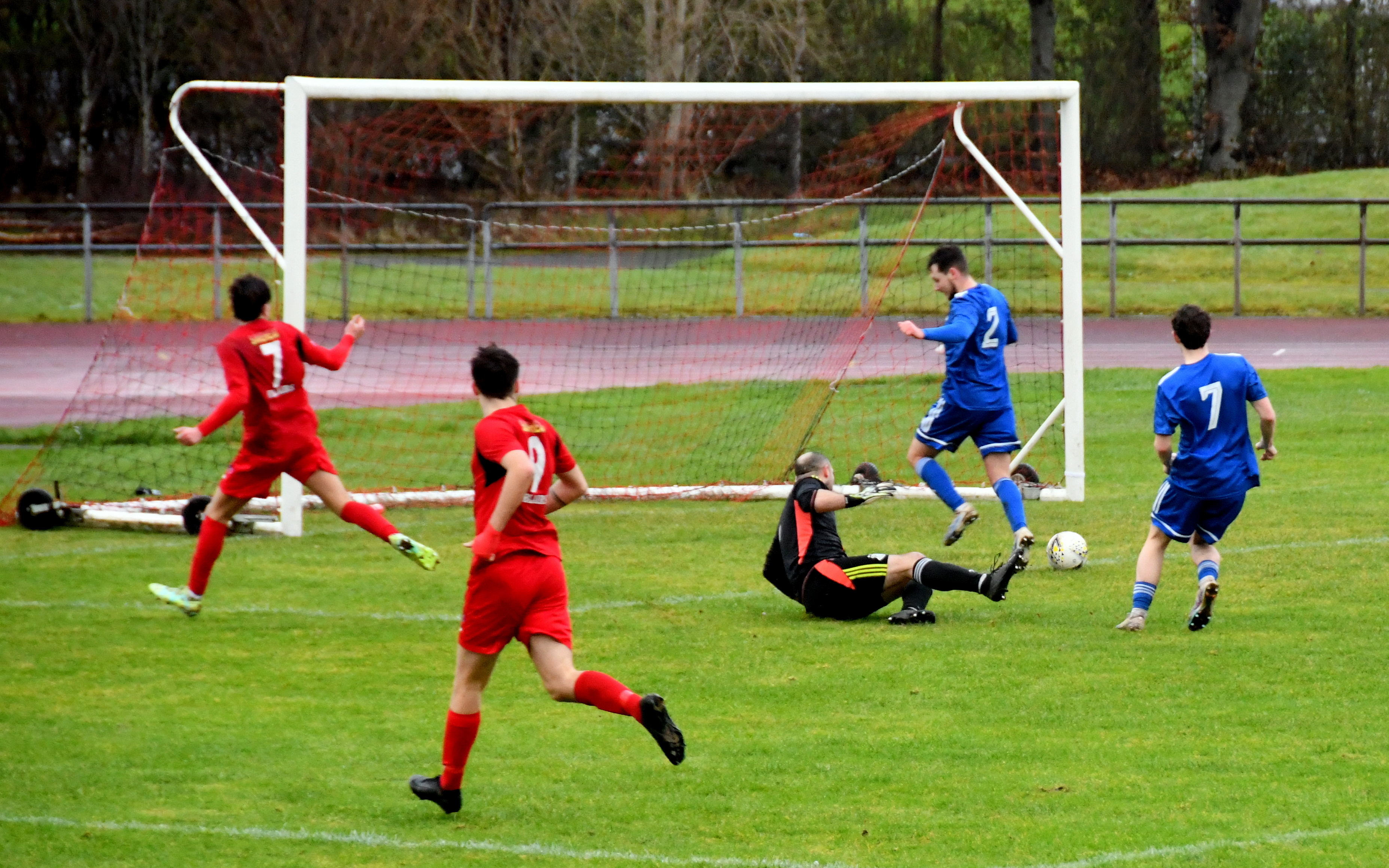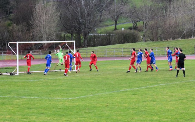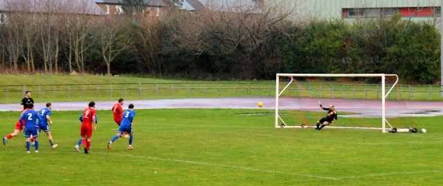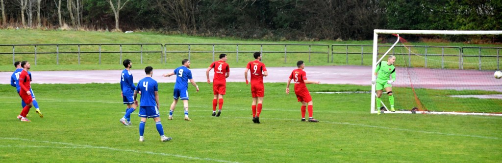 Glens kicked off and were first to threatem. Callum Wilson from the left floated a corner kick to the near post only for keeper Craig Beaton to outleap Shuggy Kerr and push the ball clear of the penalty box. Soon after Wilson trapped the ball in the ‘D’ with Ryan Sinnamon tight on his back, shirt-pulling from both players allowed Beaton to collect the loose ball.