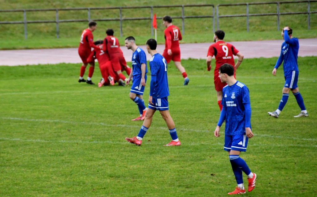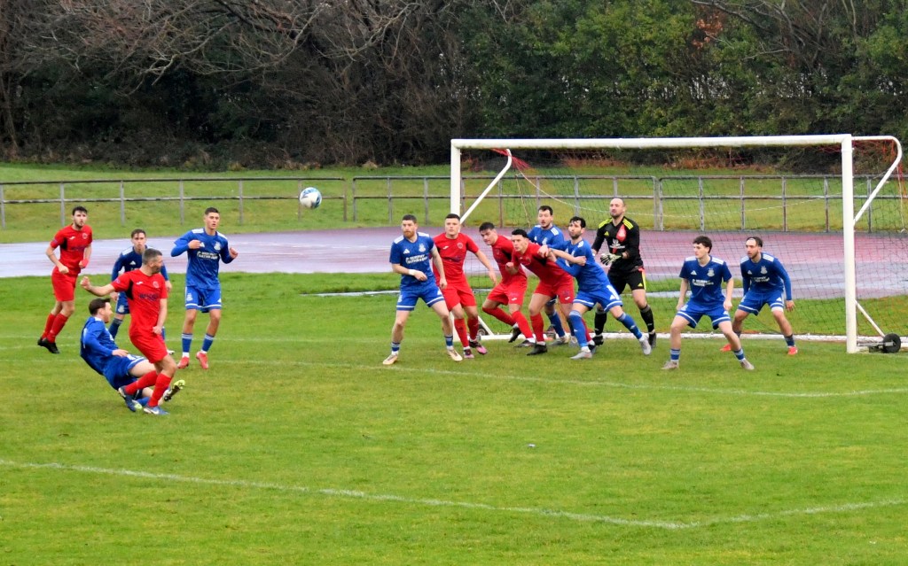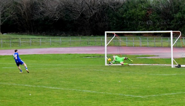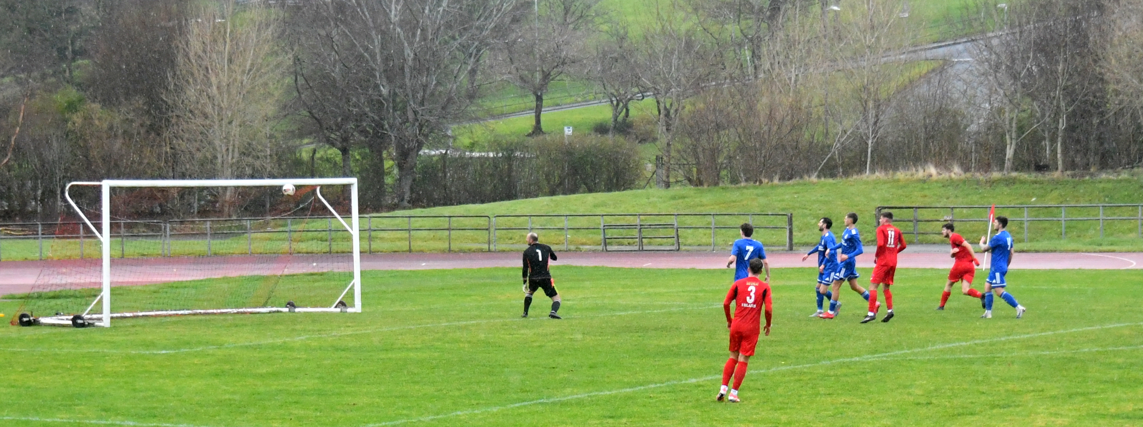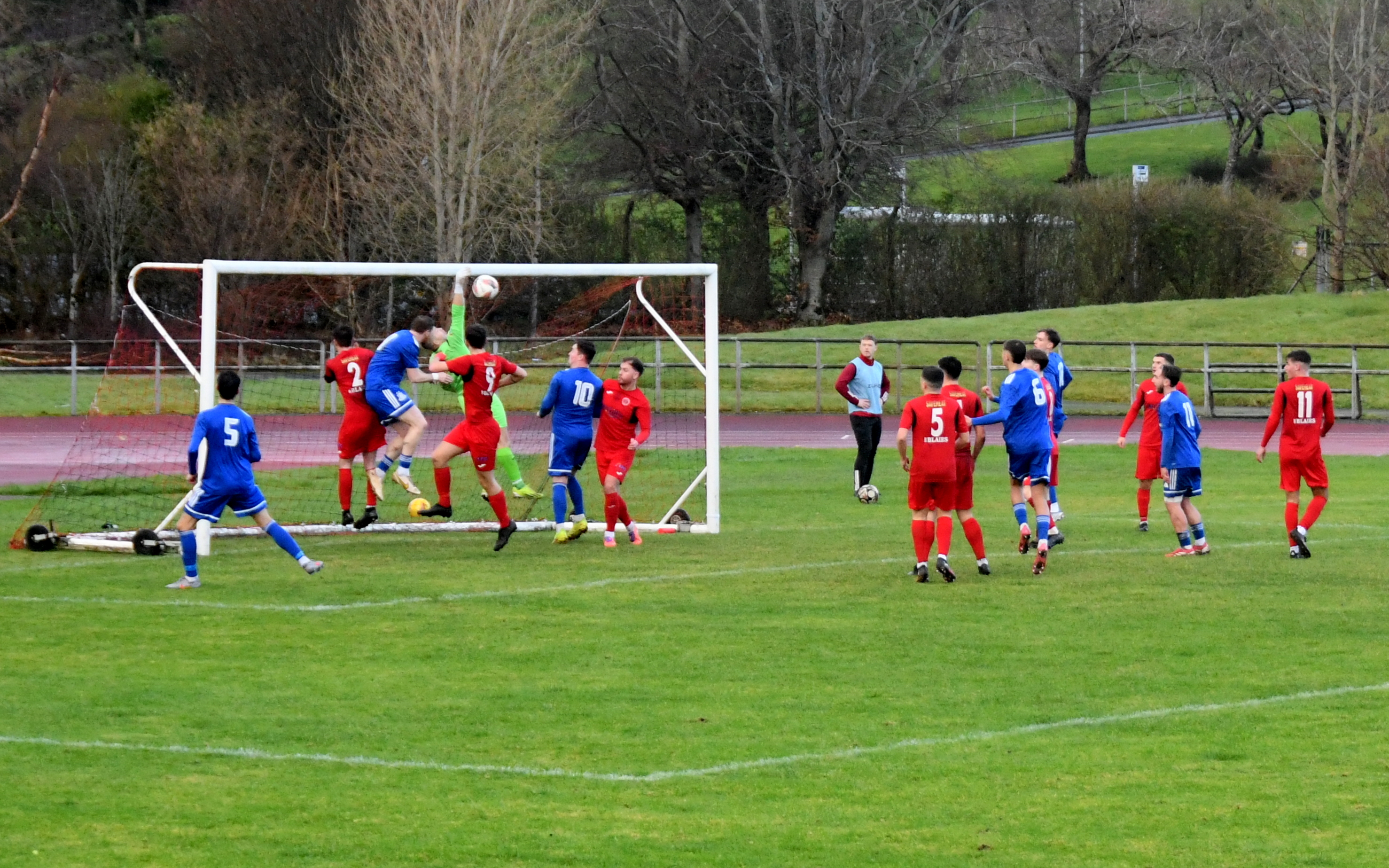Glens kicked off and were first to threatem. Callum Wilson from the left floated a corner kick to the near post only for keeper Craig Beaton to outleap Shuggy Kerr and push the ball clear of the penalty box. Soon after Wilson trapped the ball in the ‘D’ with Ryan Sinnamon tight on his back, shirt-pulling from both players allowed Beaton to collect the loose ball.