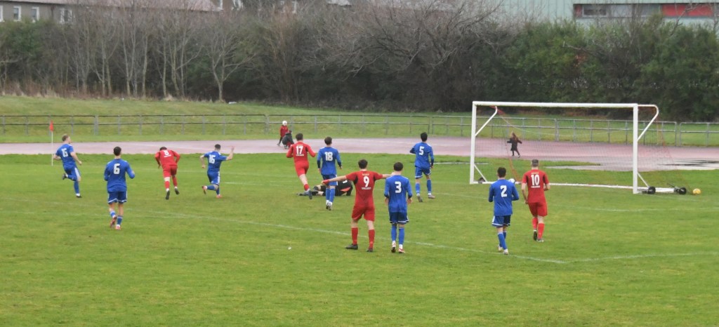 Back came Greenock, in numbers again, Barclay picked up the ball on the outskirts of the box only to be sandwiched between two Glens players on the edge of the ‘D’. Sinnamon’s free-kick crashed into the Glens wall and the ball quickly cleared from the box only to fall for Sinnamon again and his attempted chip slippped wide of the post.