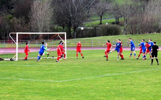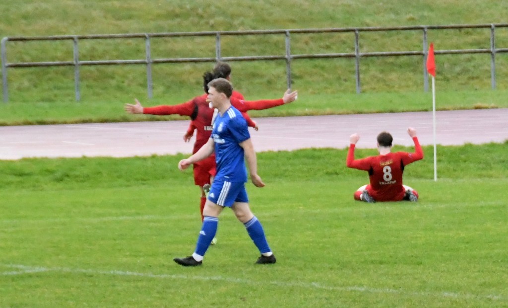 The home side came close again, after Sinnamon curled a corner-kick from the left to the back-post where Darren Boyle, held off the challenge of Kerr, to crouch and bullet a header that went inches wide of the post – a ‘hands-on-head’ moment. At the other end Glens had a couple of shots from distance which were comfortably held by Beaton.