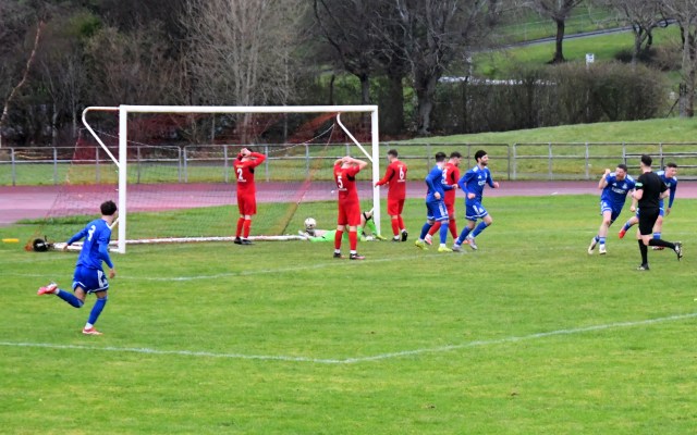 Play returned to another phase of back and forth without any clear-cut chances on show. However, on 77 minutes Greenock took the lead though Cameron Barclay with a low drive from inside the box that beat the advancing Markey. Greenock 2 Glens 1, 77 minutes.