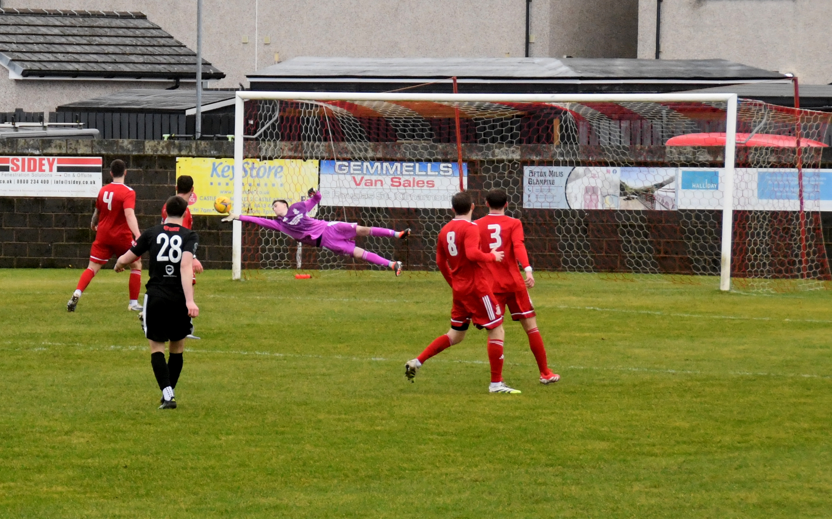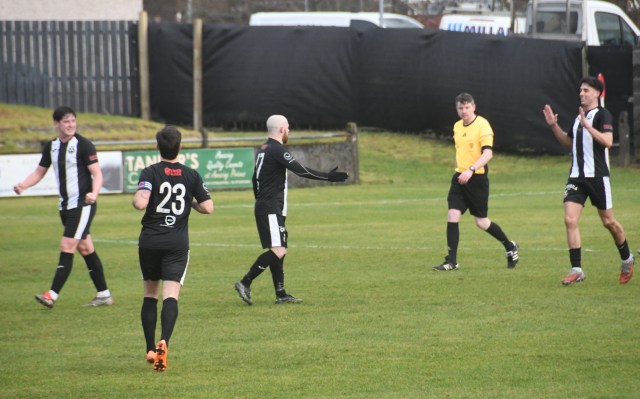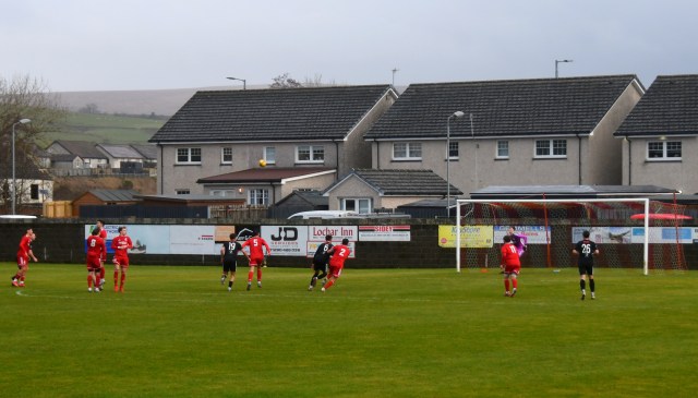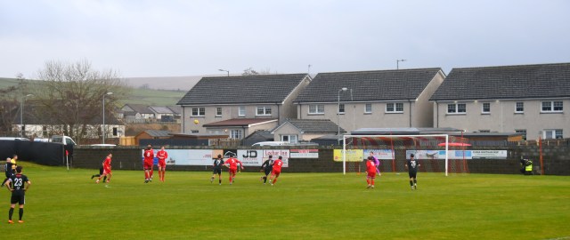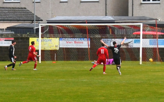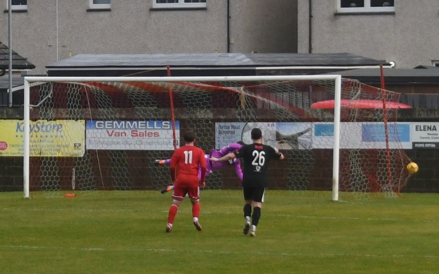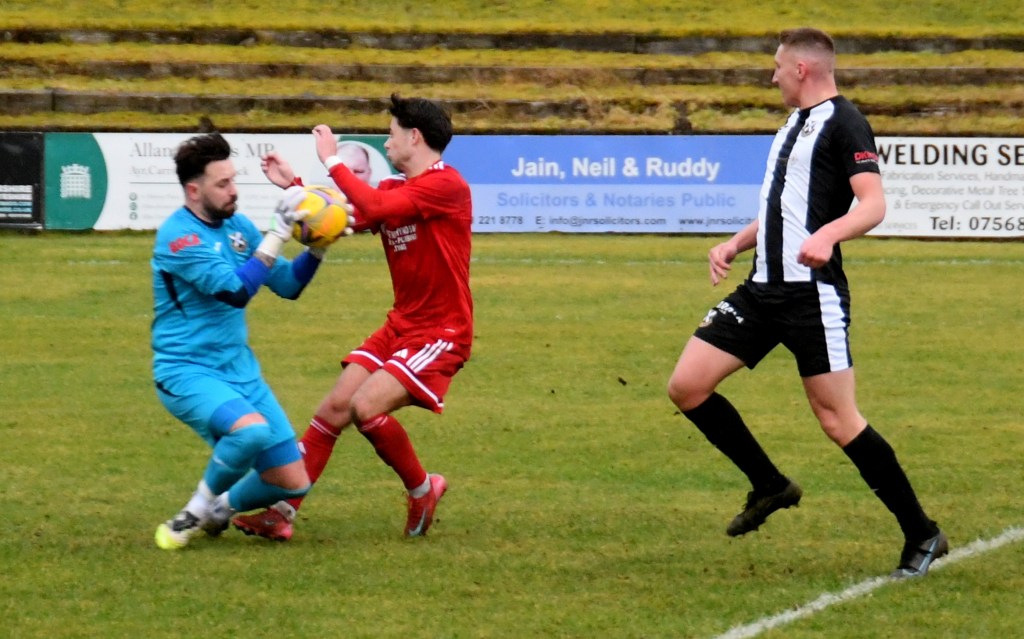 A good wee spell for home side began with Sam McKee chasing down a long ball and nipping between Cameron Henry and the outrushing McAllister, however the ball bounced favourably for the goalie who clutched it keenly forcing McKee to tumble to the ground.