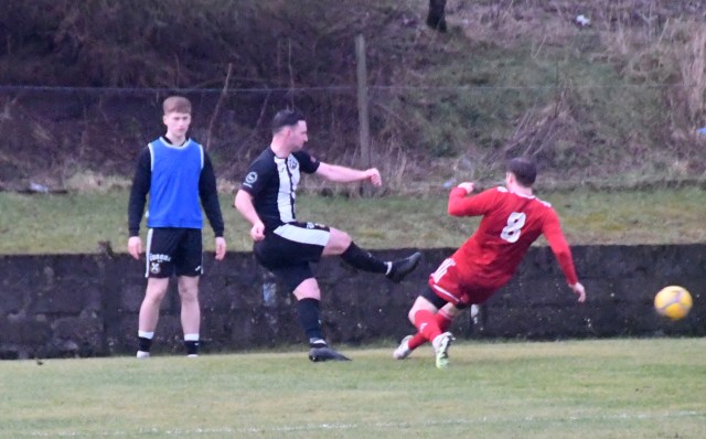 On 30 minutes, Duncanson just inside the Pollok half from wide on the left floated a free kick high into the box and although Stewart Houston won the aerial battle his header dropped into the ‘D’ where Michael Mullen met it on the drop to blast a shot that flew wide of the post.