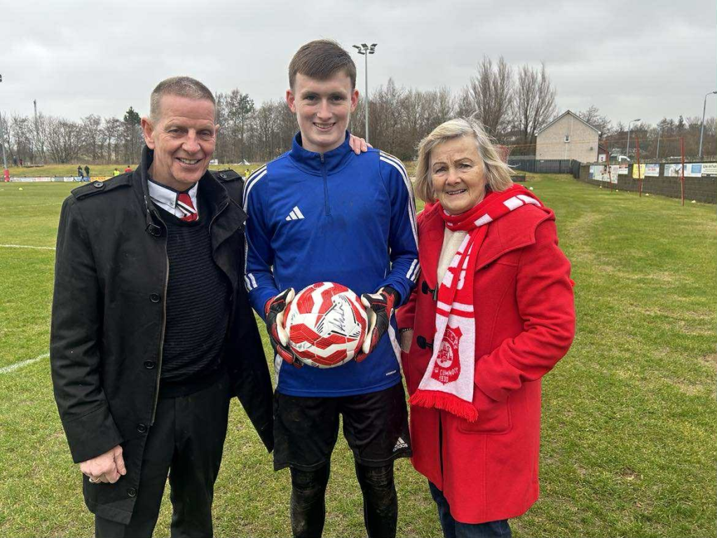 A big thank you to Marie Walker for sponsoring the match ball. Marie sponsors the match ball each year in memory of her husband Jim Walker, a lifelong Glenafton supporter. Marie is pictured before the match, with goalkeeper Ollie Ecrepont and club President John Stewart.