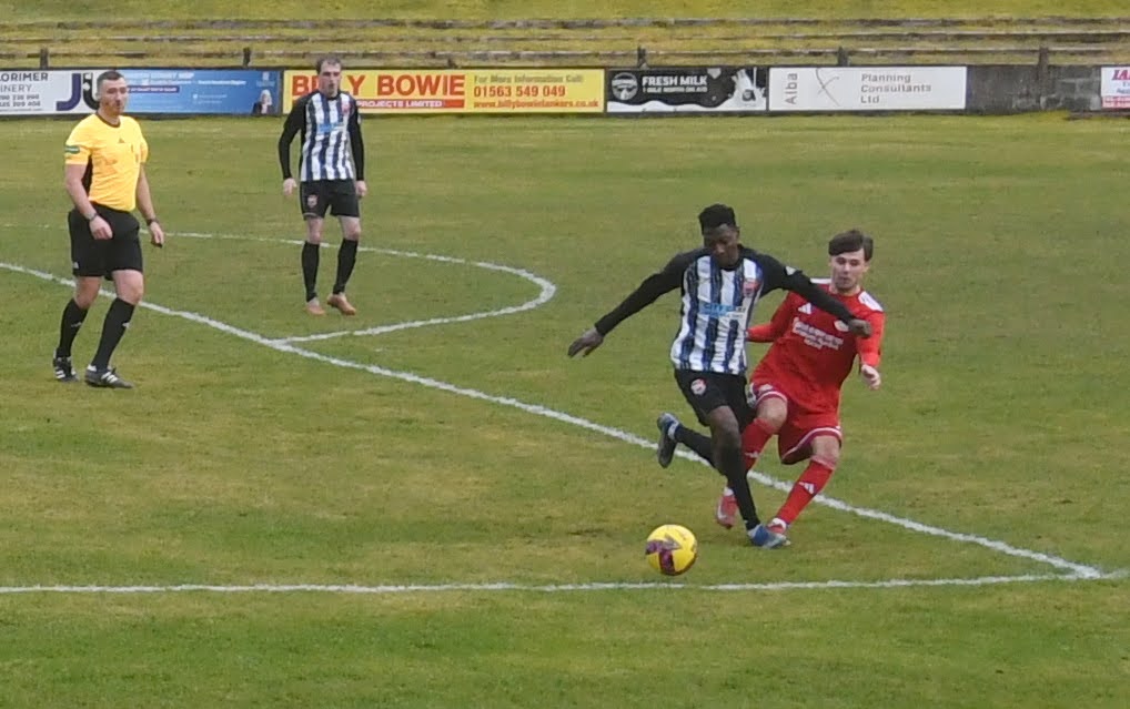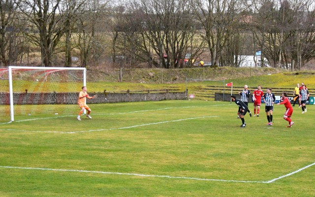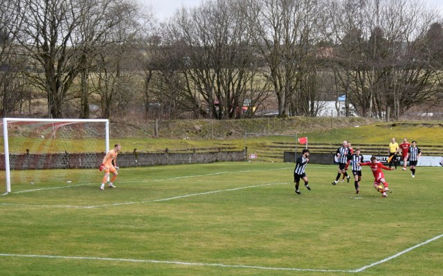 Prete, from his own half, picked out McKie just inside Drum’s half and completed the one-two as he gathered the ball on the outskirts of centre circle only to be man-handled by Frize. Low lined up the free-kick and although he beat the wall on the edge of the ‘D’ the ball bounced just inside the six-yard box and collected by keeper Cameron. Soon after Low broke down the left, whipped a ball across the goalmouth, to be chased down by Wilson who tried to pickout Petre on the penalty spot only for Frize to intercept at the expense of a corner, which was cleared.