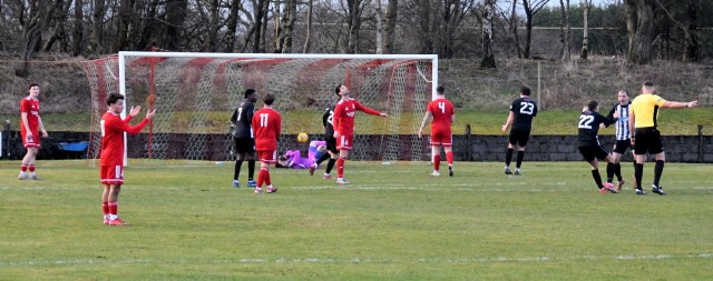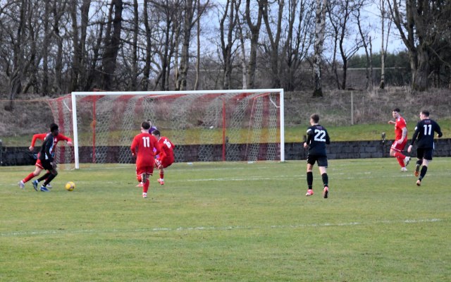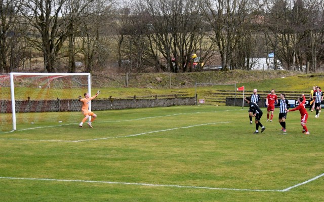 Back came the home side as McCracken headed the ball upfield from the centre-circle, gathered by Wilson to turn and hold off the clutches of McNiff to drive forward and as Davies closed in he cracked a low shot from 22 yards which the keeper dived to his left to push the ball to the side before gathering it
