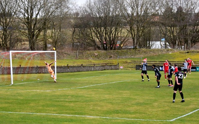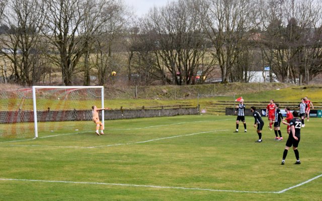 Glens were first to threaten after Wilson from the outskirts of ‘D’ engineered a low shot between Davies and Frize to fire a shot that fell for McKie on the edge of the six-yard box only for the keeper to stick out a foot to diver the ball inches wide of the post.