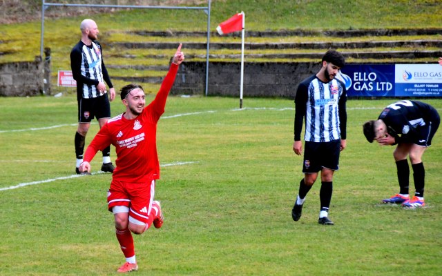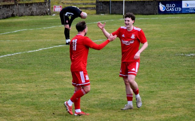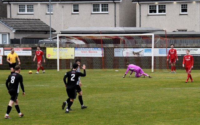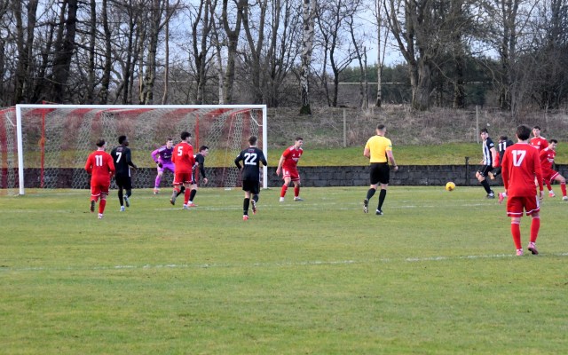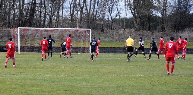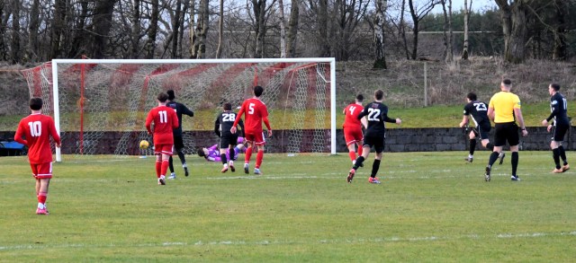 The visitors replied through Hopkirk controlling the ball on the six-yard line before setting up a shot that Low leapt to block only for Ecreport to deflect it wide for a corner as two Drum players held their head in their hands, while Hopkirk claimed the ball hit Low on the hand/arm? Both sides then made a case but referee awarded the penalty kick and it was David Hopkirk that slammed the spot kick home, sending the keeper wrong way. Glens 1 Drum 2, 52 minutes.