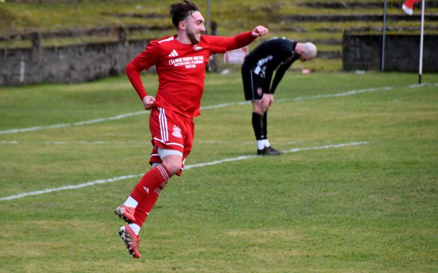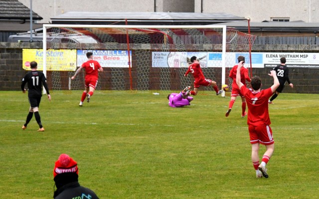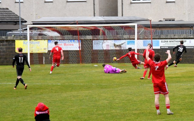 The pressure paid off after Ross Lindsay released Kerr down the right, to square a pass into the box where Callum Wilson beat Callum McKenzie to the ball and with his back to goal, near the penalty spot, he swivelled to hook a ferocious shot which deflected off defender Davie, sending the ball high into the air before dropping beyond the reach of leaping keeper spot and into the net. Glens 1 Drumchapel 0, 15 minutes.