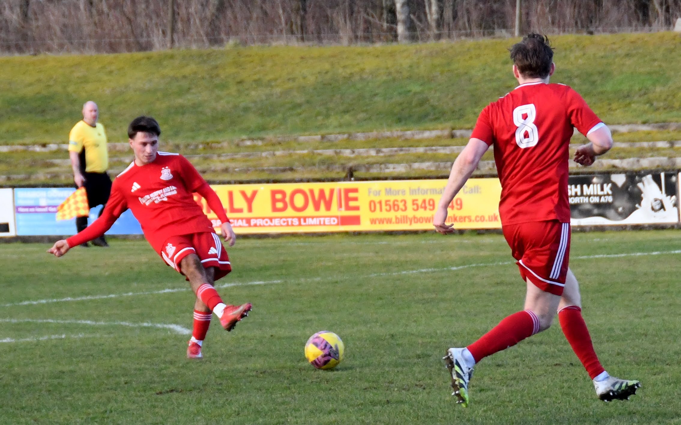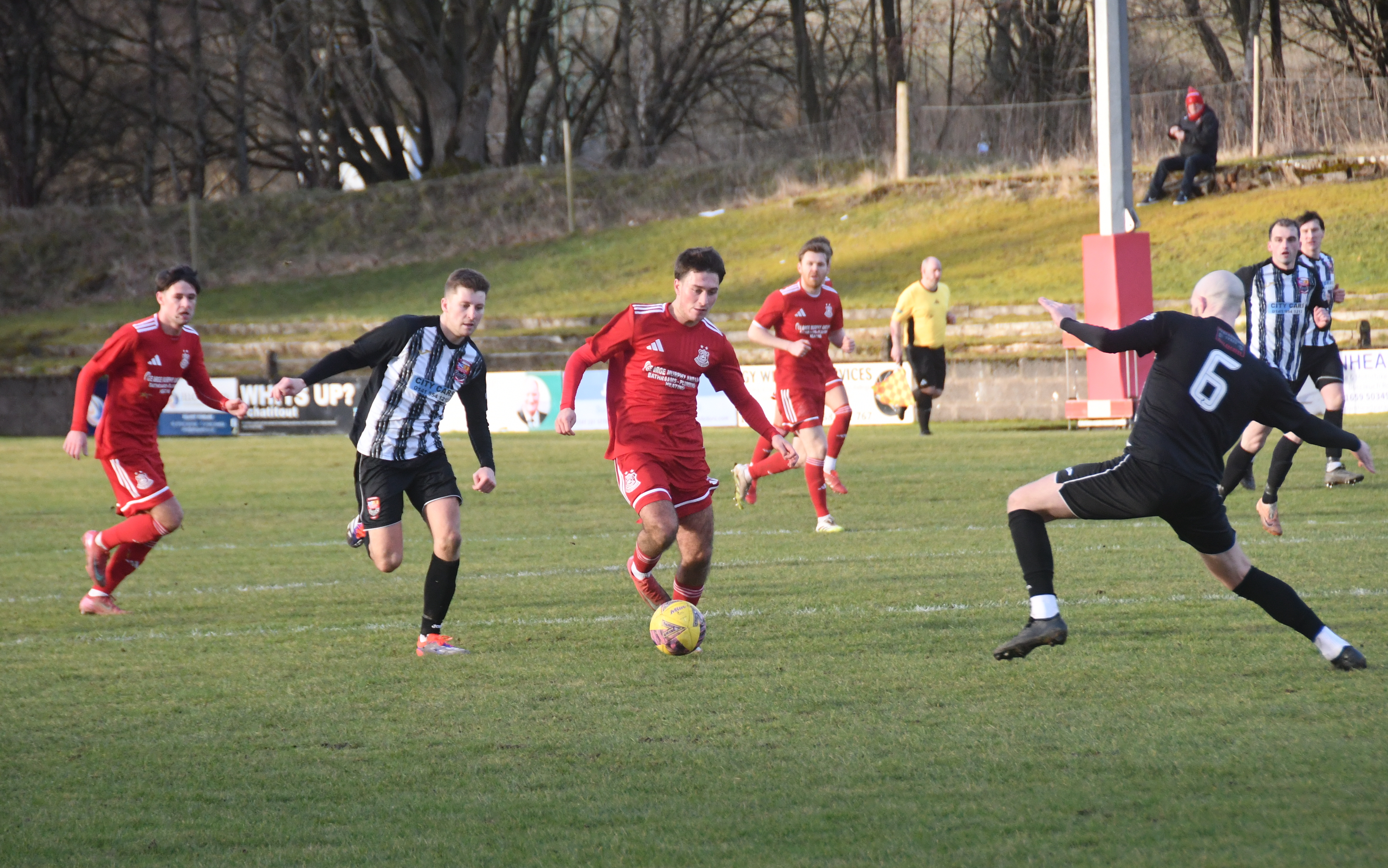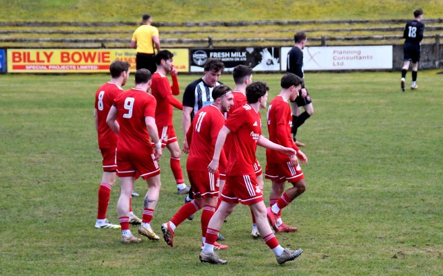 At the other Martin McNiff lost control of the ball in the box as Kerr gave chase as the keeper came off his line pull up and in discomfort, and let ball run out for corner-kick. On came the physio the striker’s game was over and made way for Sam McKie.