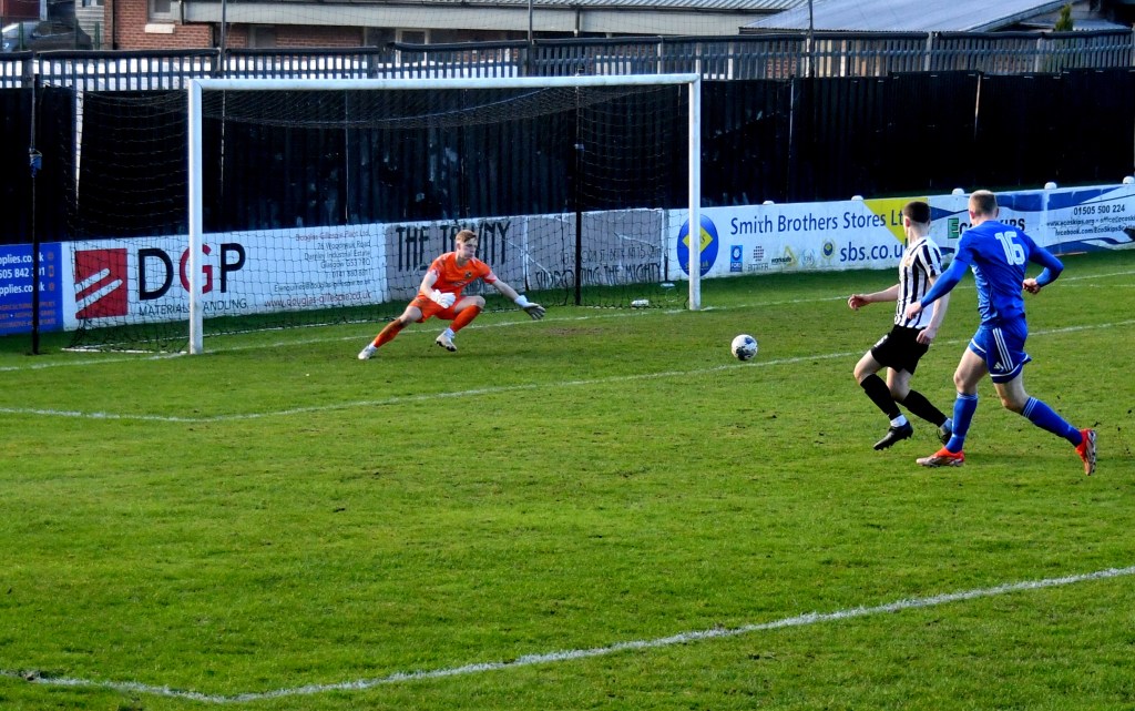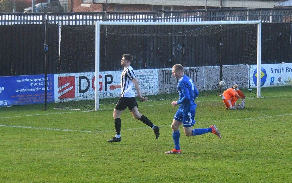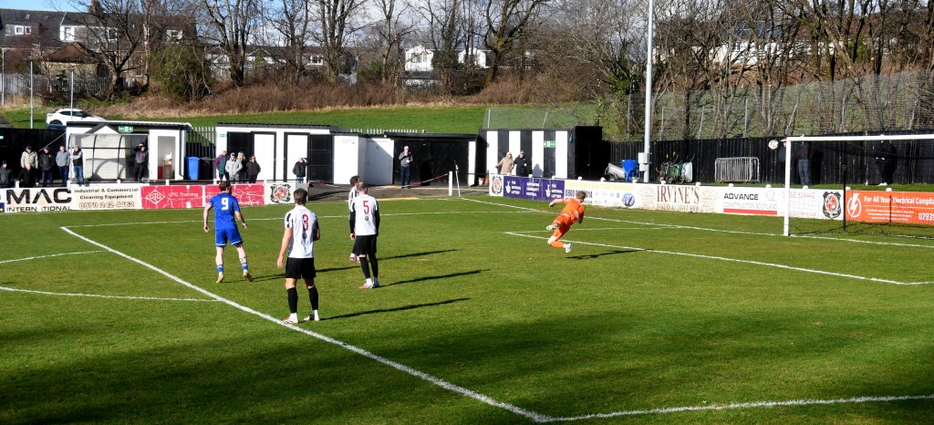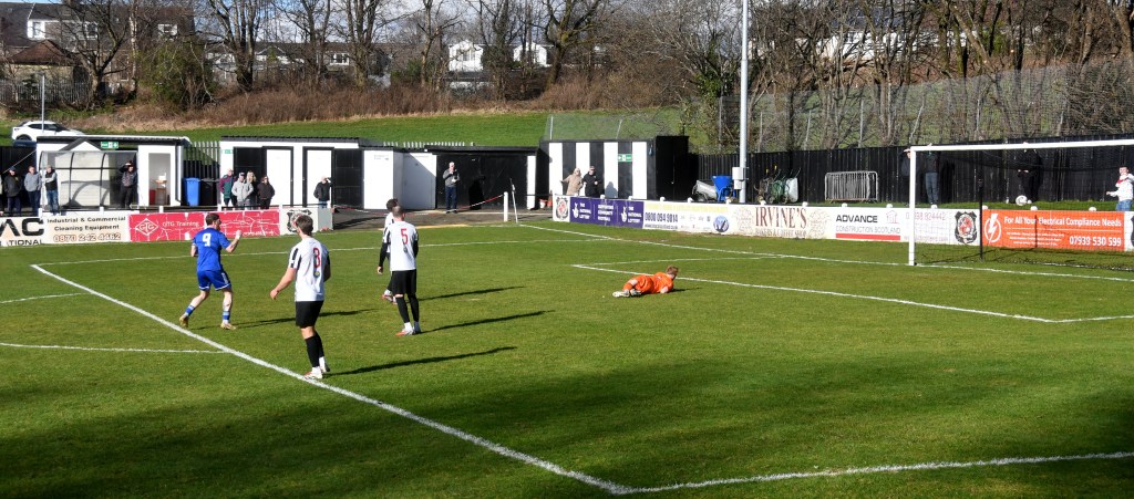 Beith were quickly on the front foot only for Jamie Wilson to strip Don Morgan of the ball and set up a counter attack which saw a Callum Wilson header snapped up by McDermott to release Jamie Prete to break into the right-hand side of the box only for Rumsby to intercept and clear. Back came Beith with new signing Andrew Stirling driving forward before picking out Morgan in space only for his shot from 16 yards to fall comfortably into the arms of keeper Ollie Ecrepont.