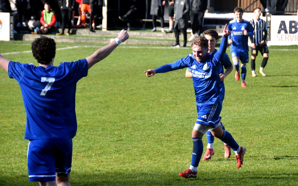 Head-tennis on the half-way line saw Callum Wilson’s header upfield being returned high into the Glens half by Rumsby for Kamil Krol only for Craig Menzies to intercept and a guide a low header that was gathered by Mullen and laid off to Low on the left touch-line. From here, just inside the Beith half, the young full-back launched a high ball for Kerr just inside the box, forcing the keeper to rush from his line and as the two leapt together the keeper’s hold on the ball was released by the striker’s head and fell for Rumsby to lash it clear only to be met by Callum Wilson to sweetly strike a shot from 25 yards plus to whiz over the head of Kerr and a clutch of defenders and beyond the reach of the retreating keeper leaping high, some 8 yards of his goal-line, before dipping under the bar and bulging the net. Beith 0 Glens 1, 14 minutes.