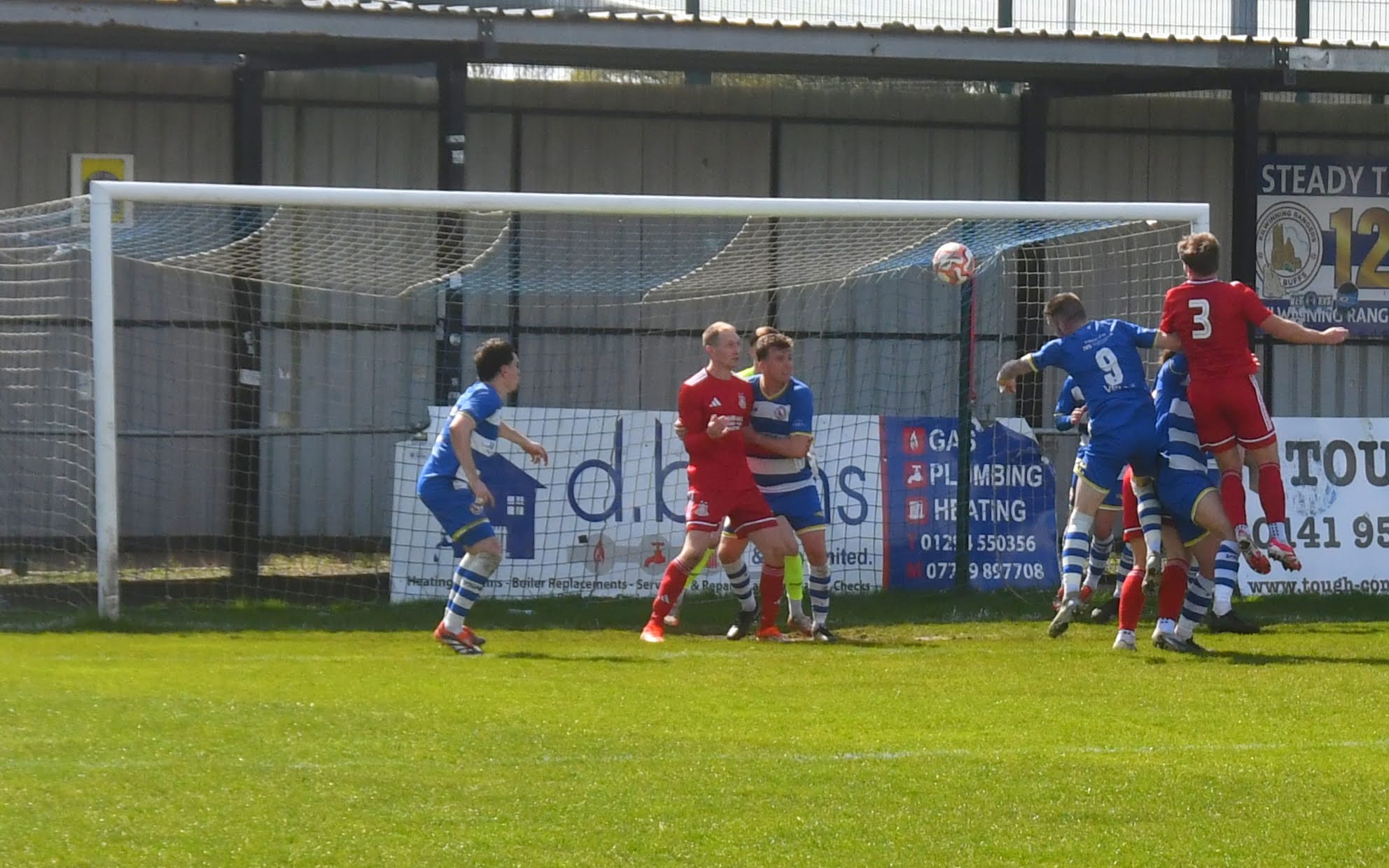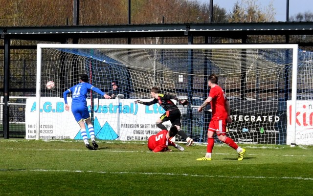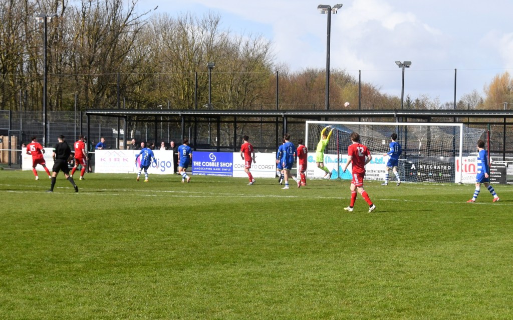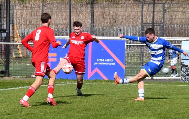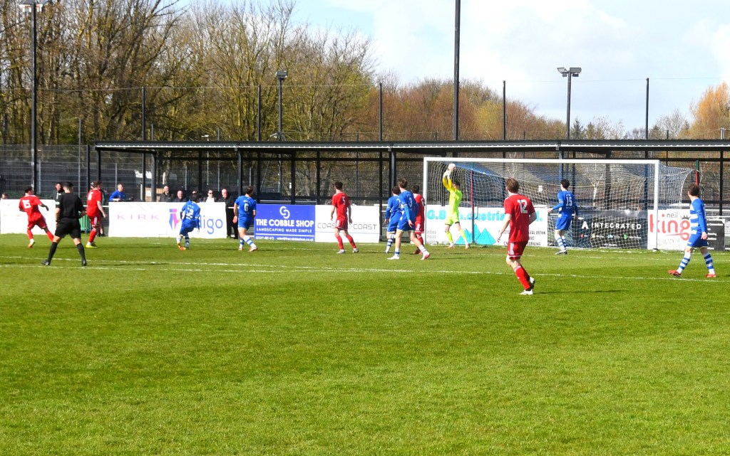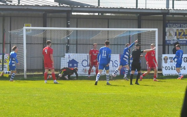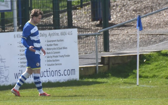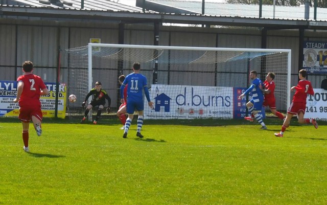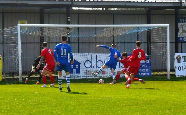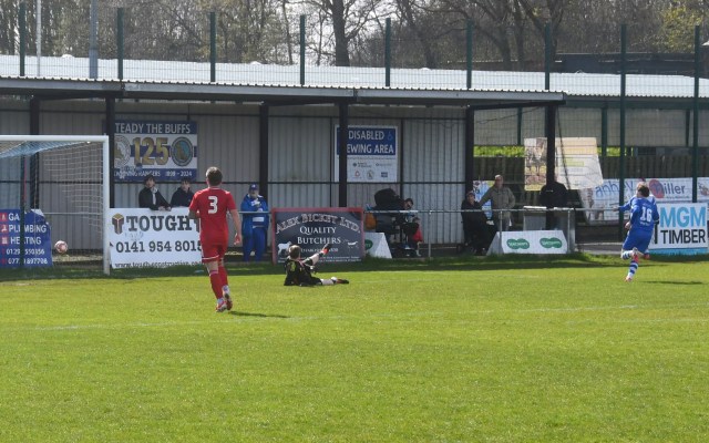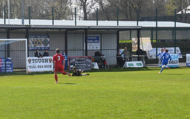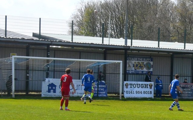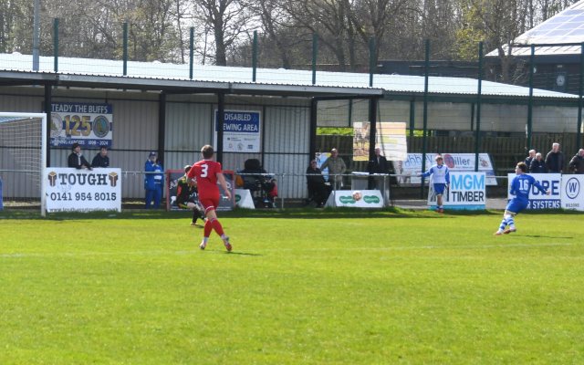 Meanwhile Kilwinning continued to spread the ball about at pace and doubled their lead on 21 minutes after play was switched from left to right where Harry Weir curled a cross through the gap between McDermott and David Craig for the incoming Wilson marked by Ollie Rowe, only for the ball to swerve past both players and into the net at the far post. Buffs 2 Glens 0, 21 minutes.