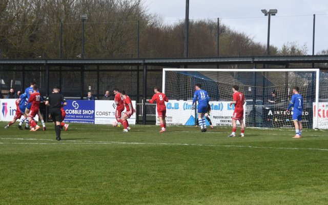 Jack MacCalman, long throw specialist, launched a ball from the left, deep into the Glens box where Ryan Wilson won the aerial battle only for his header to flash wide of the corner of post and cross bar. Soon after Wilson cut in from the left along the bye-line only for his low shot to be blocked by keeper Ollie Ecrepont at the base of the near post.