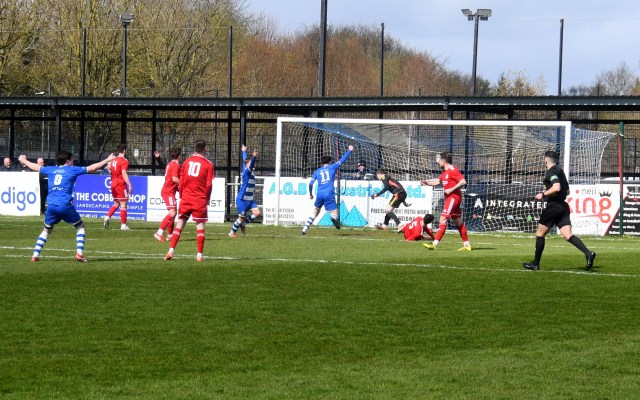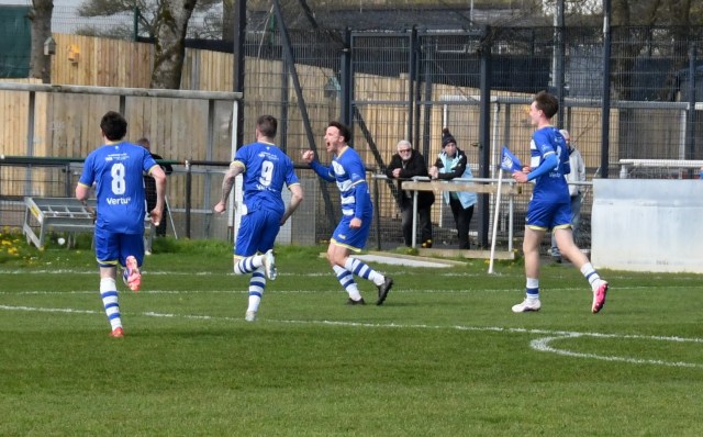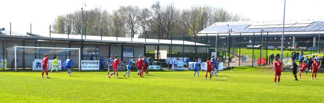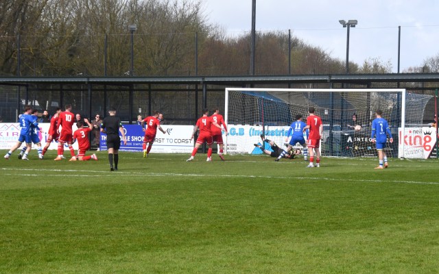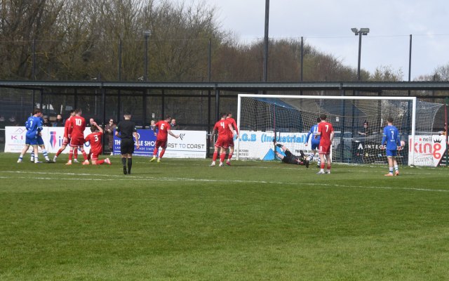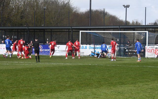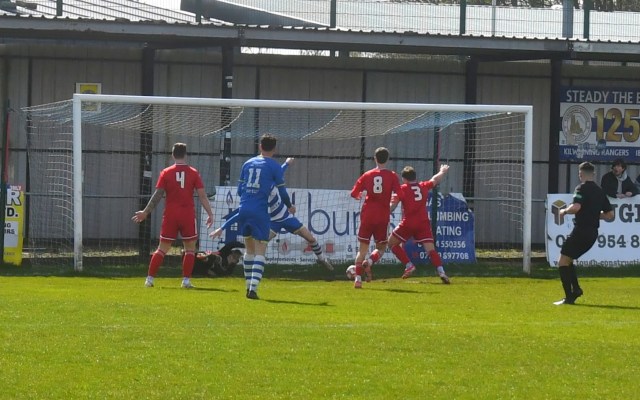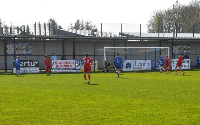 However, the Buffs responded with three goals in a fifteen minute spell beginning on 49 minutes after Robbie Scullion picked up the ball on the left side of the box before squaring it across the face of goal through the gap between the keeper on the near post and McCracken on the six-yard line for the incoming Bryan Boylan to get in front of Little and scramble the ball over the line. Buffs 3 Glens 0, 49 mins.