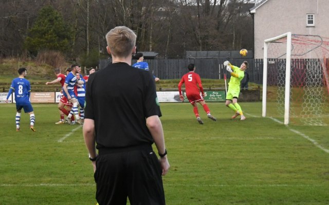 Glens kicked off and were first to threatem. Callum Wilson from the left floated a corner kick to the near post only for keeper Craig Beaton to outleap Shuggy Kerr and push the ball clear of the penalty box. Soon after Wilson trapped the ball in the ‘D’ with Ryan Sinnamon tight on his back, shirt-pulling from both players allowed Beaton to collect the loose ball.