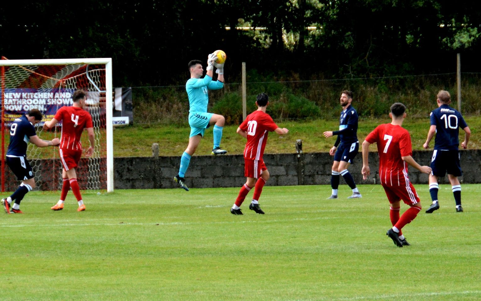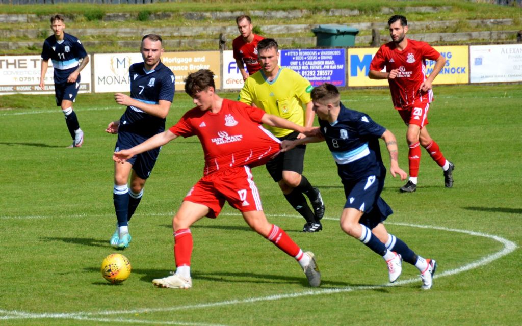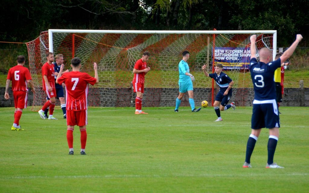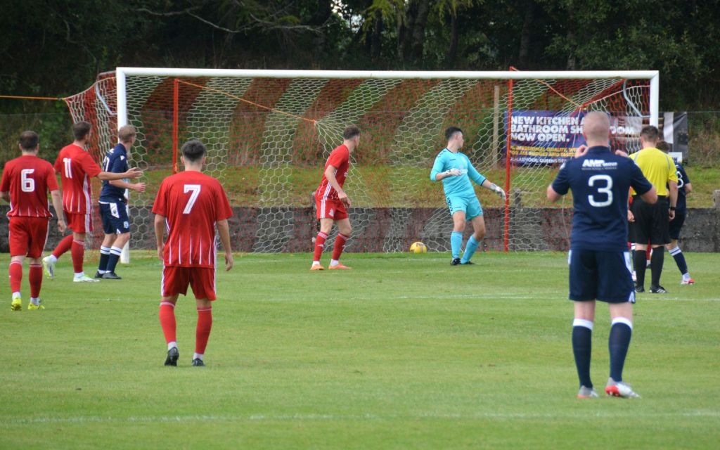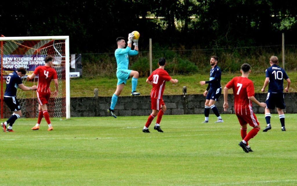 It appeared to have the desired effect as the tempo picked up and some decent half-chances emerged at both ends, beginning at the Gartcairn goal. Charlie Maxwell gathered a throw-in from McLean deep on the left before cutting along the goal-line to thread a ball between keeper and No. 4 guarding the near post for Dylan O’Kane arriving at the far post. Although, No. 3 intercepted the pass he mistimed his clearance and the ball only bobbled out the six-yard box where No. 8 got a crucial touch as Ollie Rowe had lined-up a shot at goal, however Moffat chased down the loose ball and curled a shot from 12 yards only for No. 4 to stand firm and block it with his chest on the six-yard line.