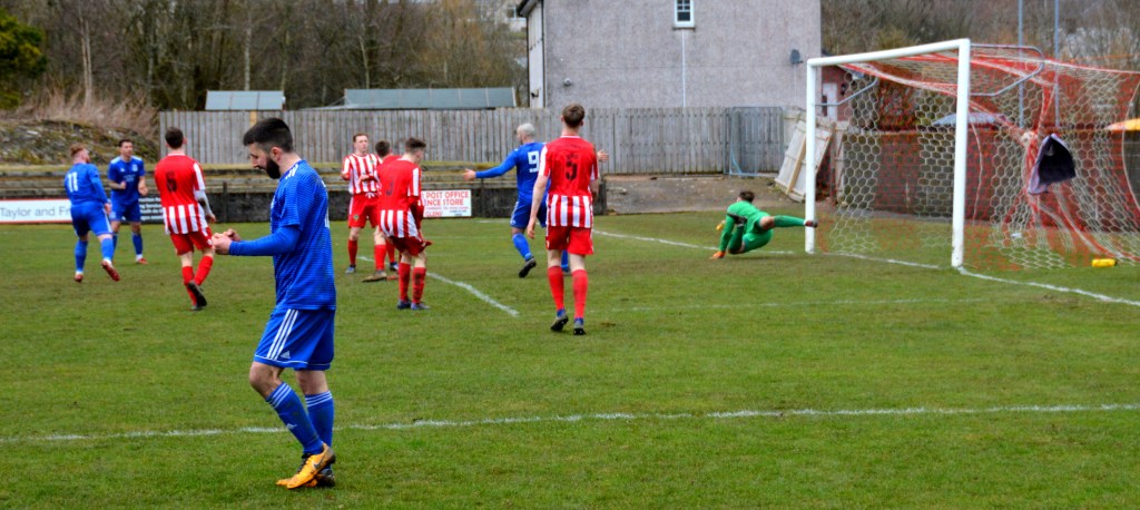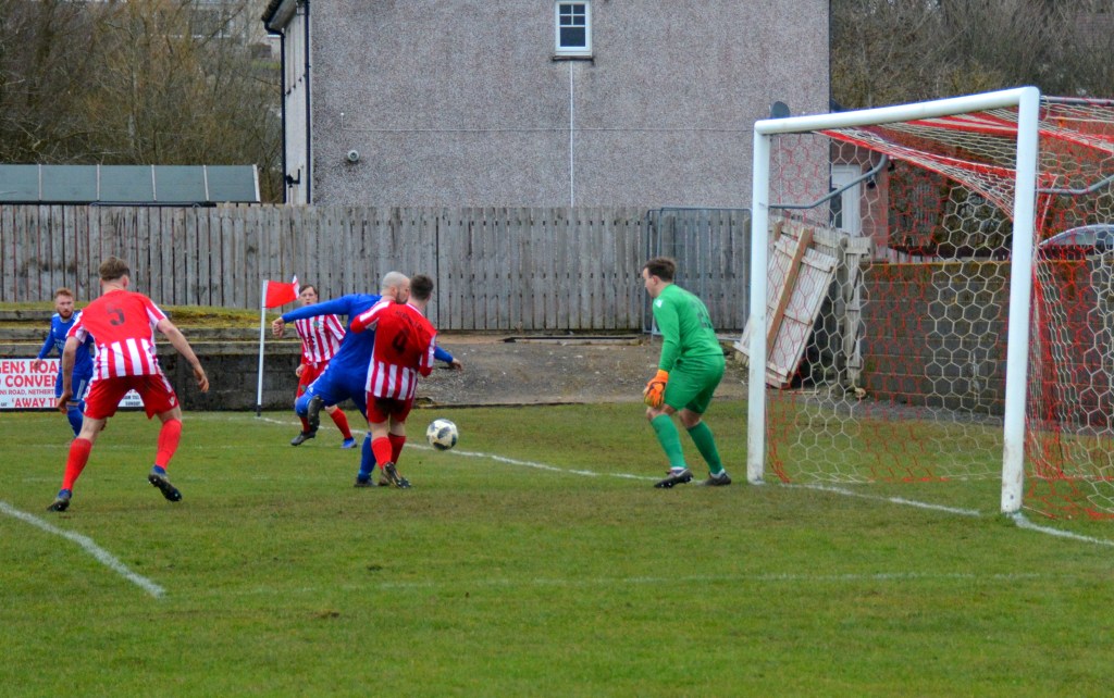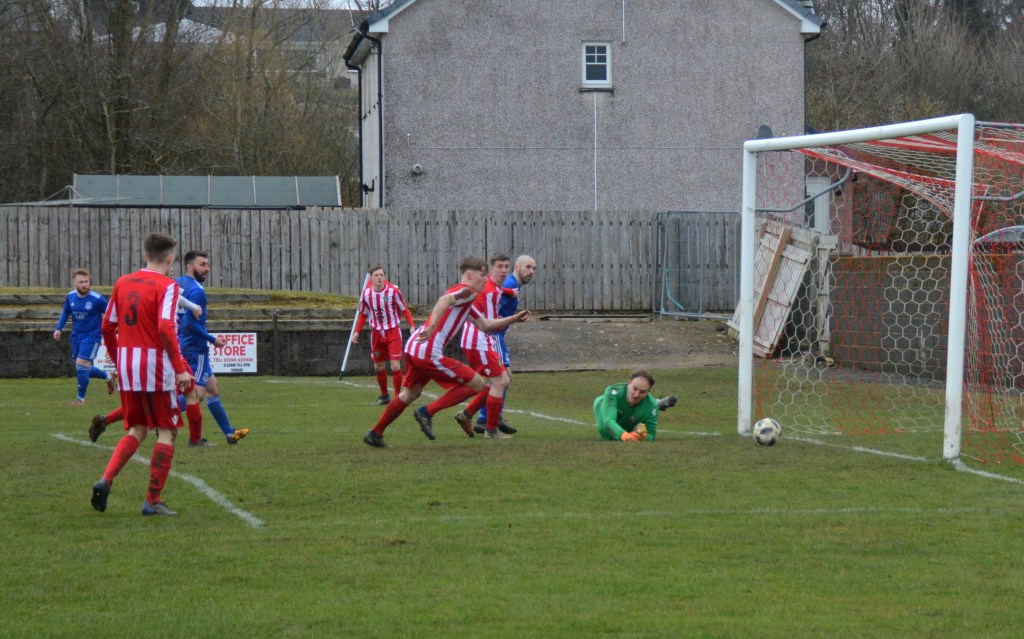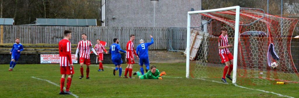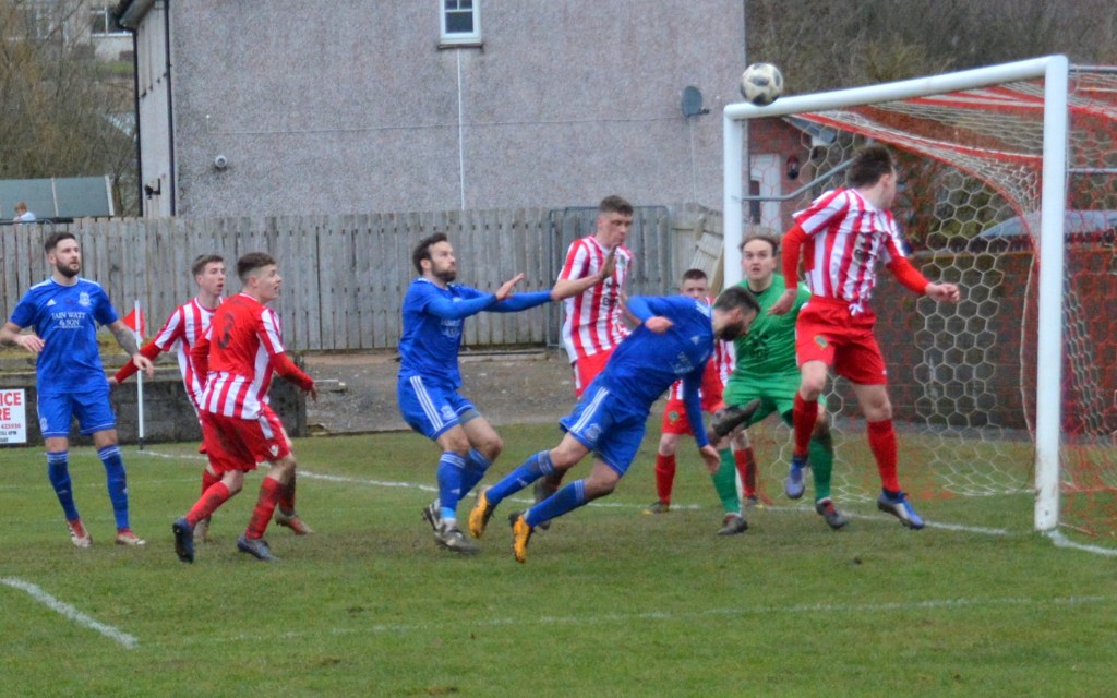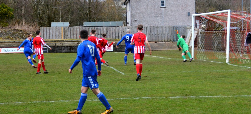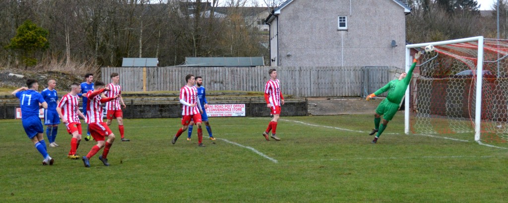 Muirkirk countered with a well worked move down the right flank ending with Ferris clipping a marvellous ball to the far post for the incoming Dillon McLauchlan only for Wallace to time his tackle to perfection at the expense of a corner which was headed clear by McCann.