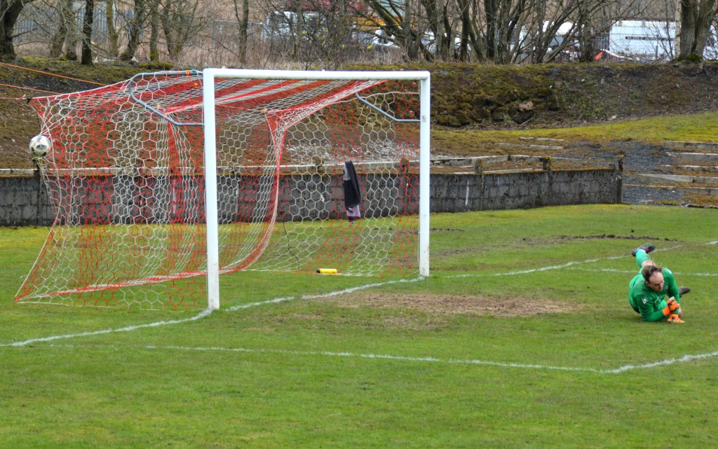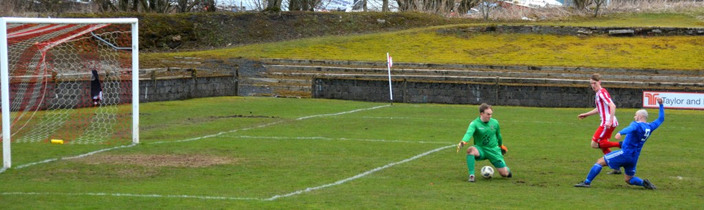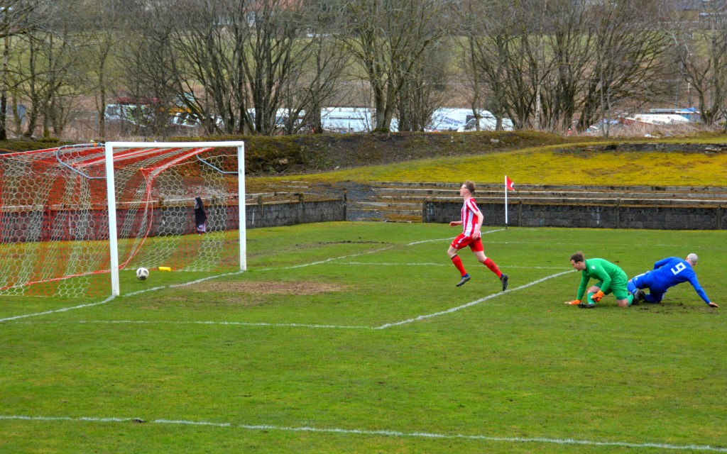 On 27 minutes Muirkirk broke upfield once again. Ferris threaded a perfectly paced forward pass for Nathan Gordon to chase down and as the Glens defence were caught out expecting play to stop for offside (as did the photographer!) the midfielder gathered the ball and lashed an unstoppable shot from 14 yards into the top corner of the net.