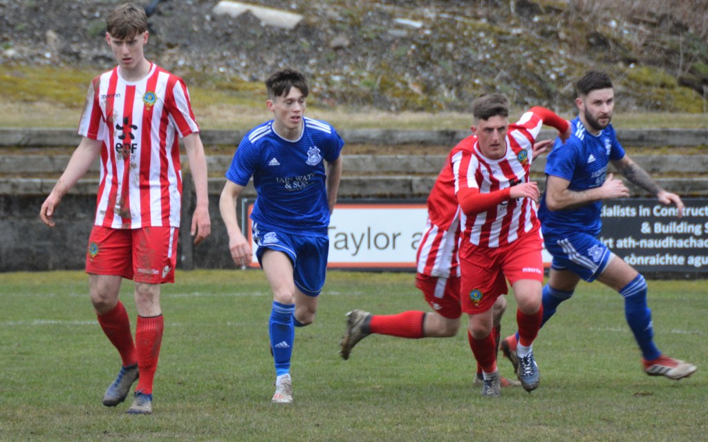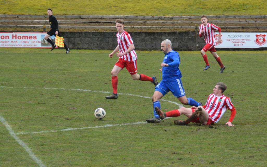 Sustained pressure from the Glens was met with a well drilled defence and a keeper on top of his game. Cameron and Alan Cairns combined down the left before the latter whipped a dangerous ball to the back post only for Bogle to rise and grab it with both hands under pressure from the incoming Moore.