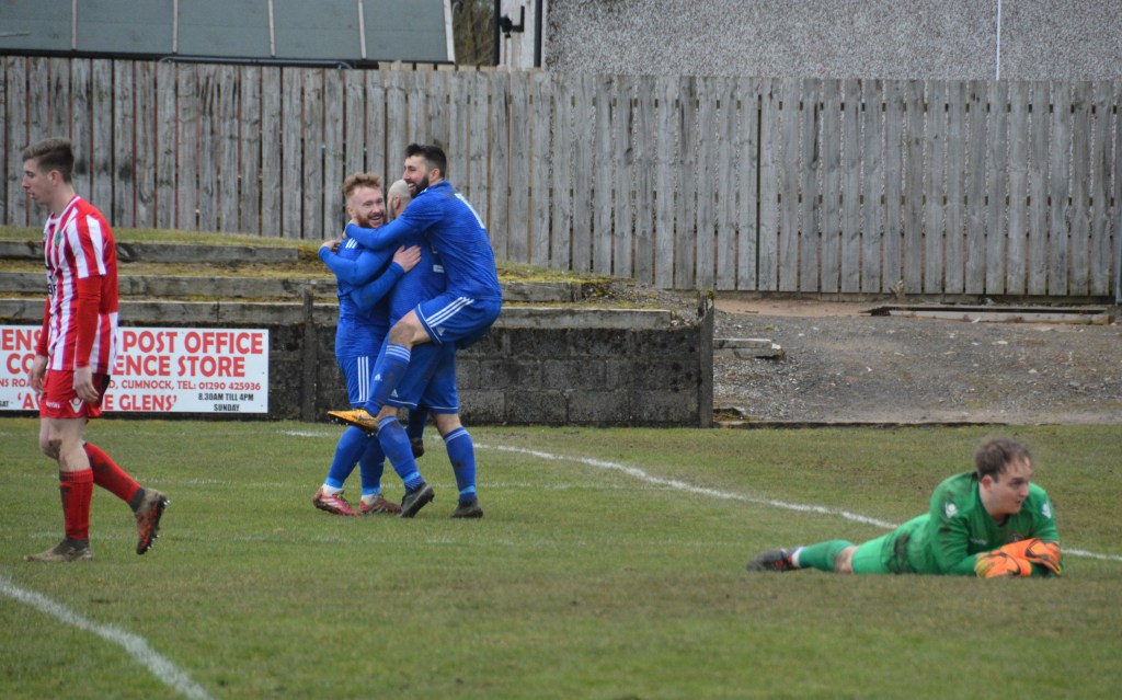 Glens immediately broke upfield and there was McCann in the six yard box to get on the end of a super ball from Gallacher to head it down for Joe Andrew to get the jump on Josh Rodgers to guide the ball home. Muirkirk’s claims for offside were waved away and the home side were now ahead on 67 minutes.